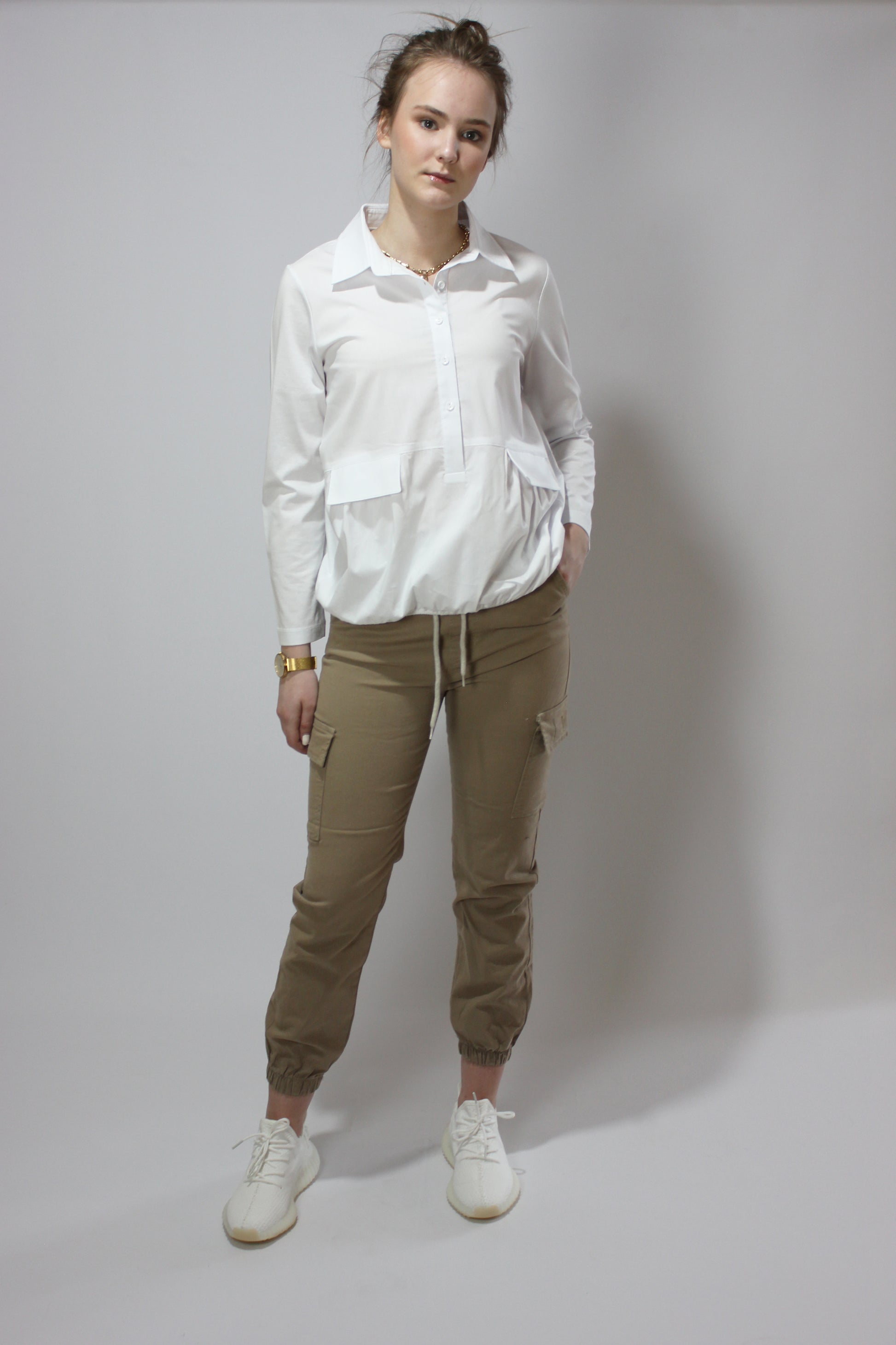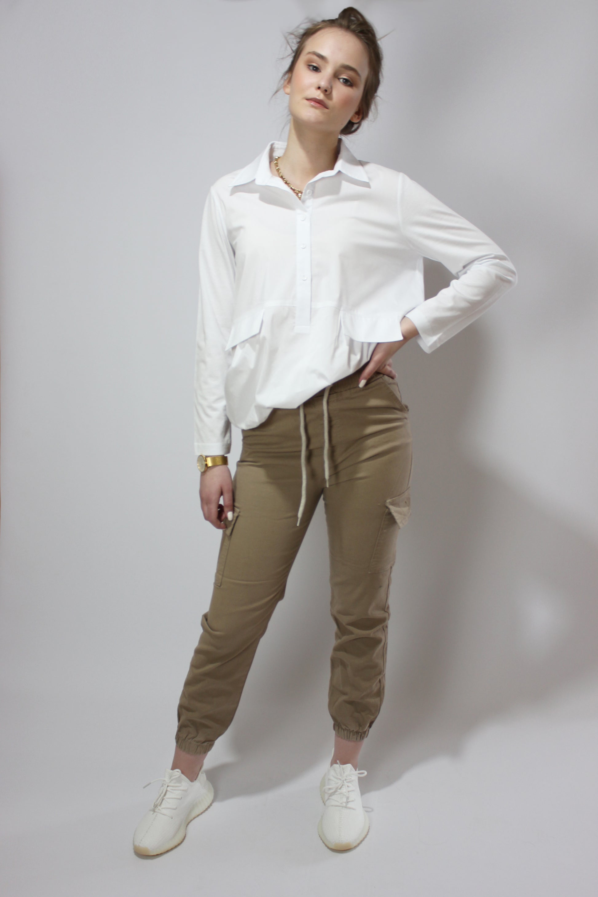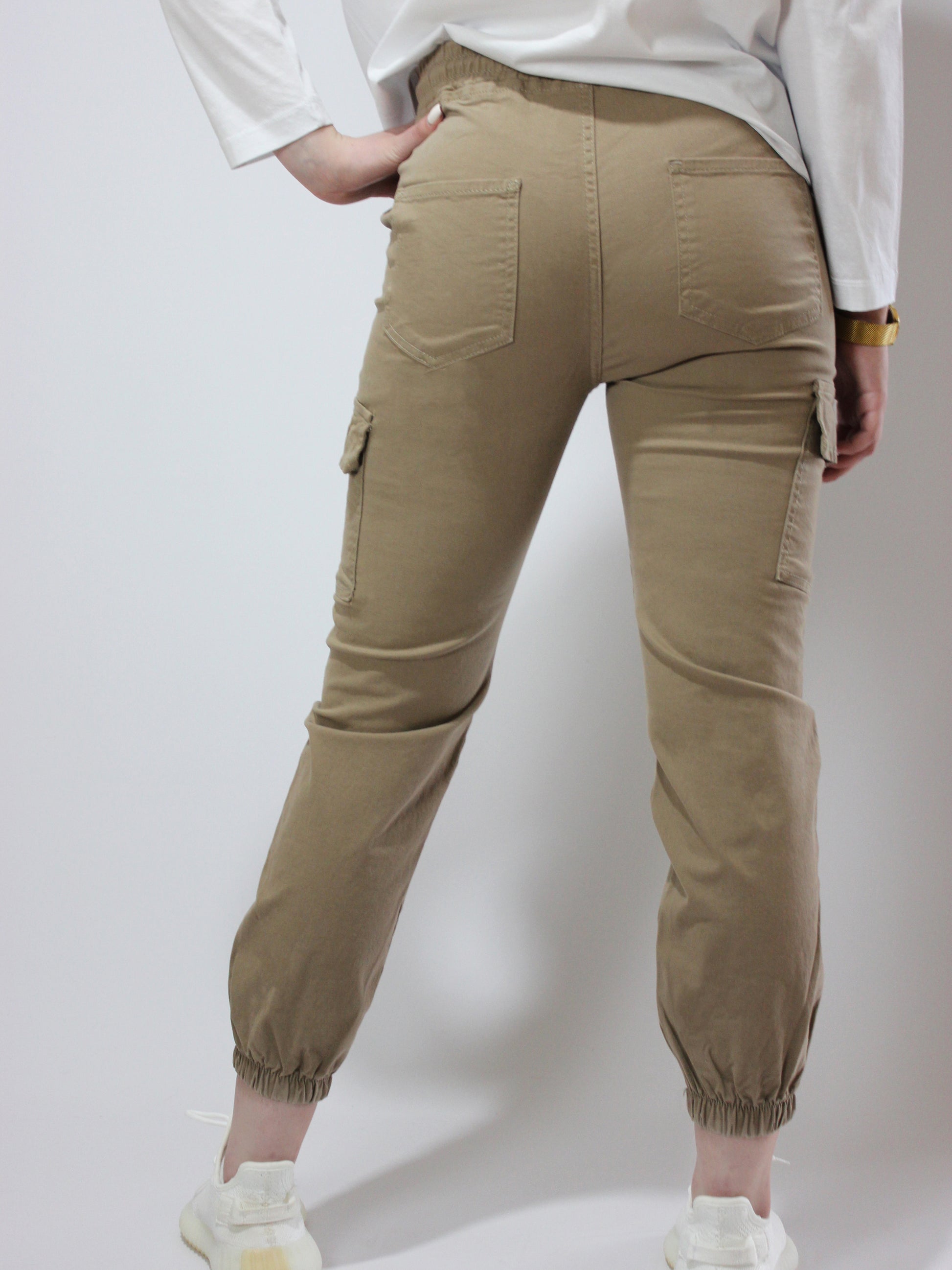 Мягкий, спортивный, неэластичный натуральный хлопок с резинкой. Молния не нужна. Длина до щиколотки с резинкой внизу. Боковые и передние карманы. Также доступен в цвете хаки
