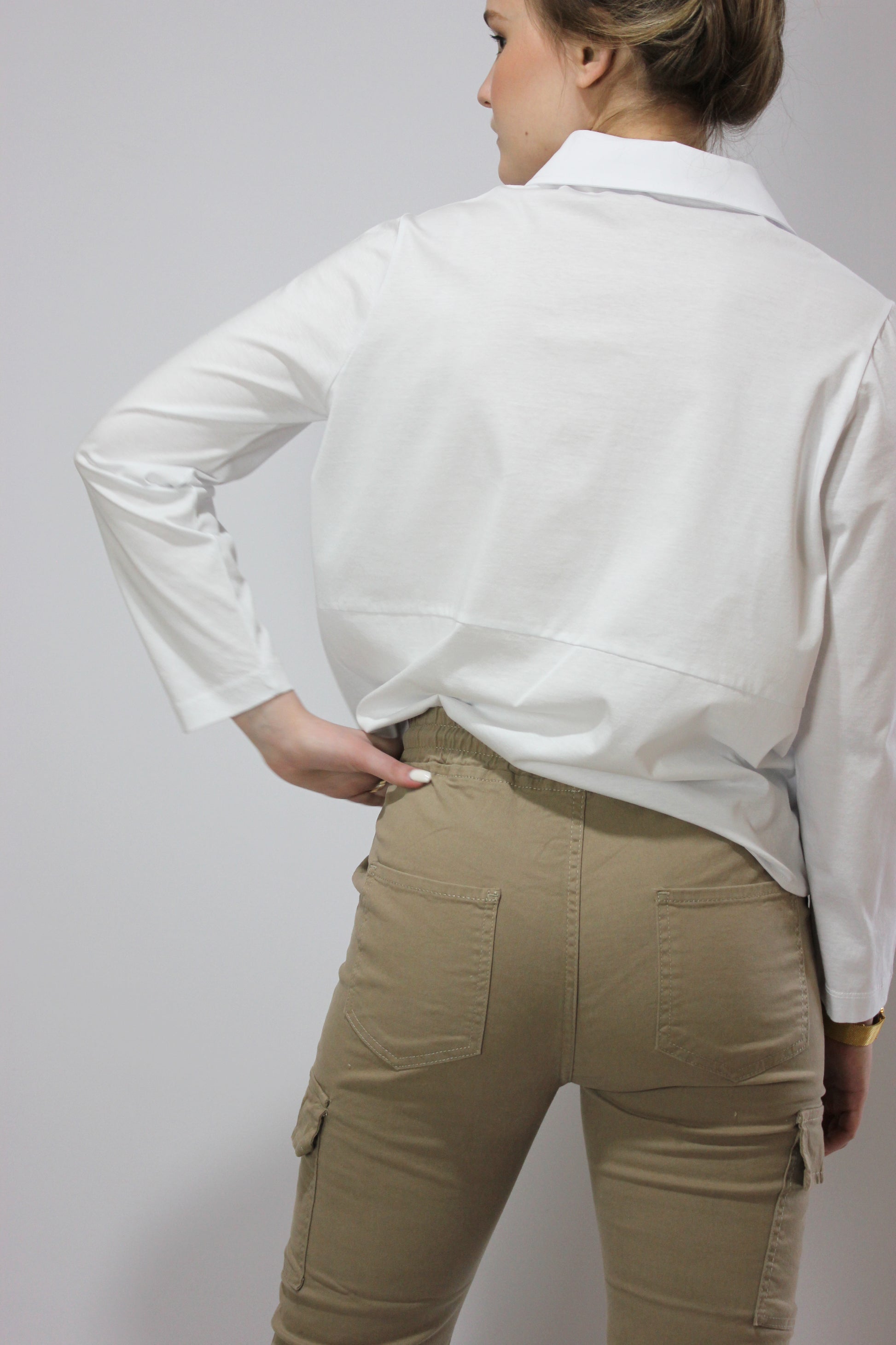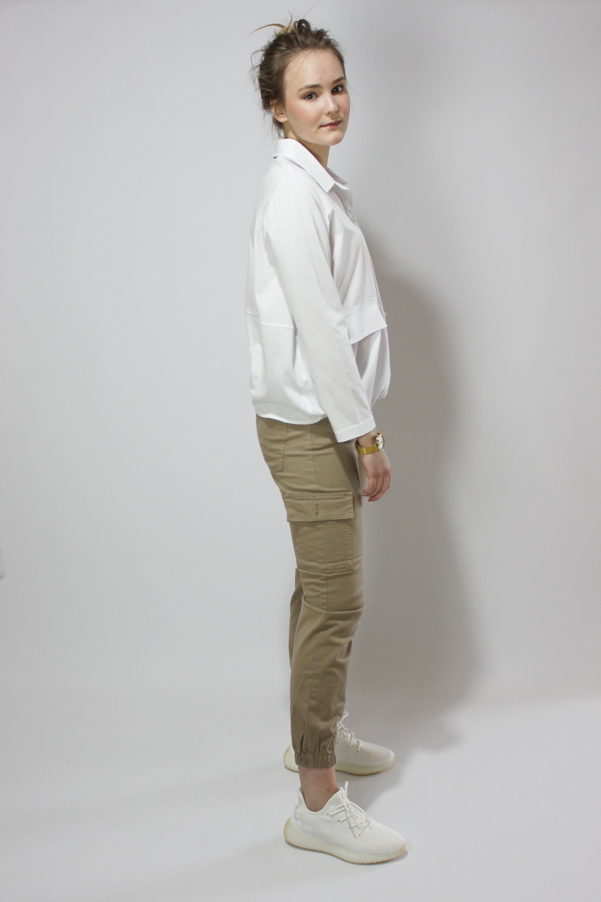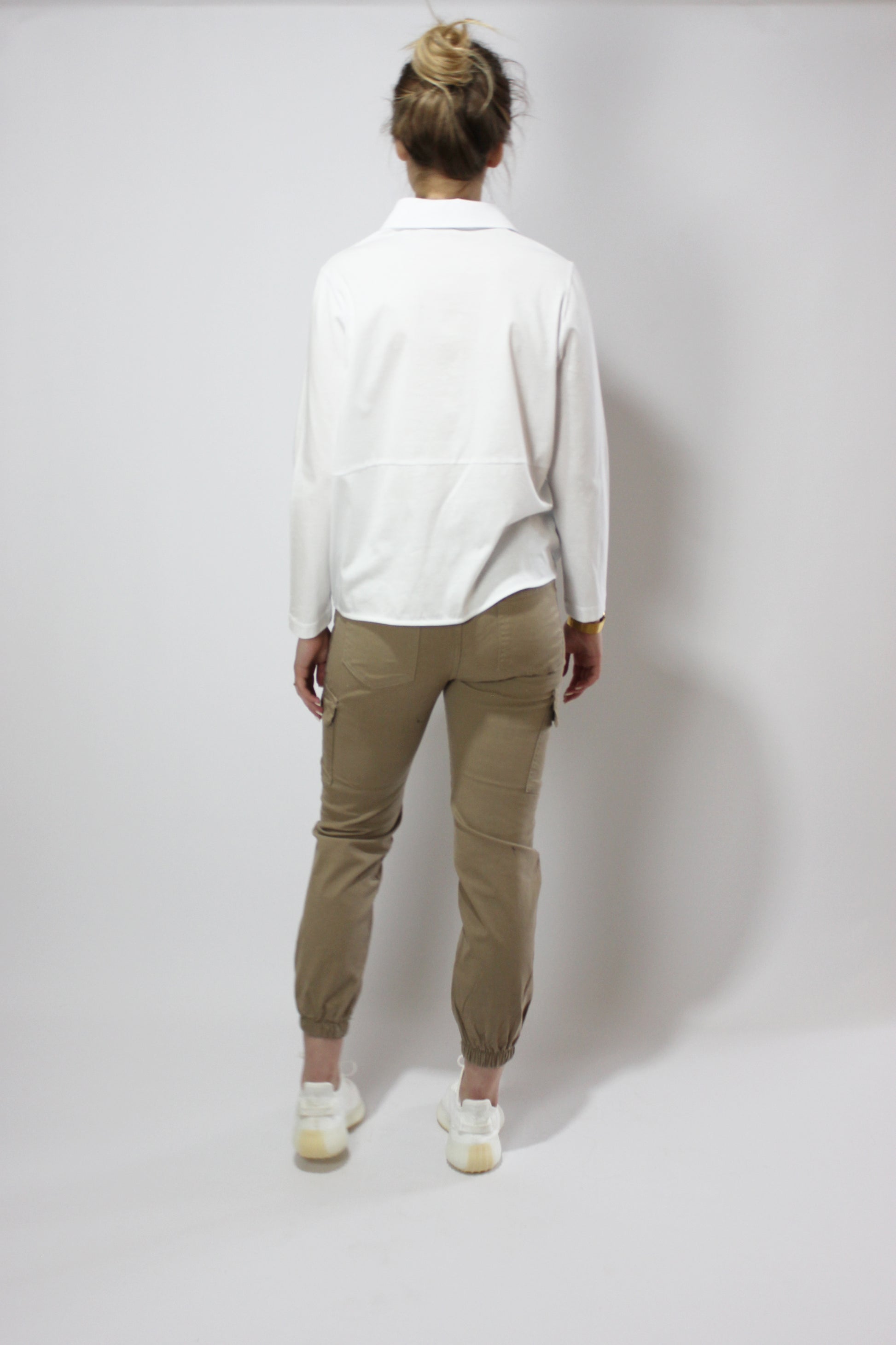 Мягкий, спортивный, неэластичный натуральный хлопок с резинкой. Молния не нужна. Длина до щиколотки с резинкой внизу. Боковые и передние карманы. Также доступен в цвете хаки