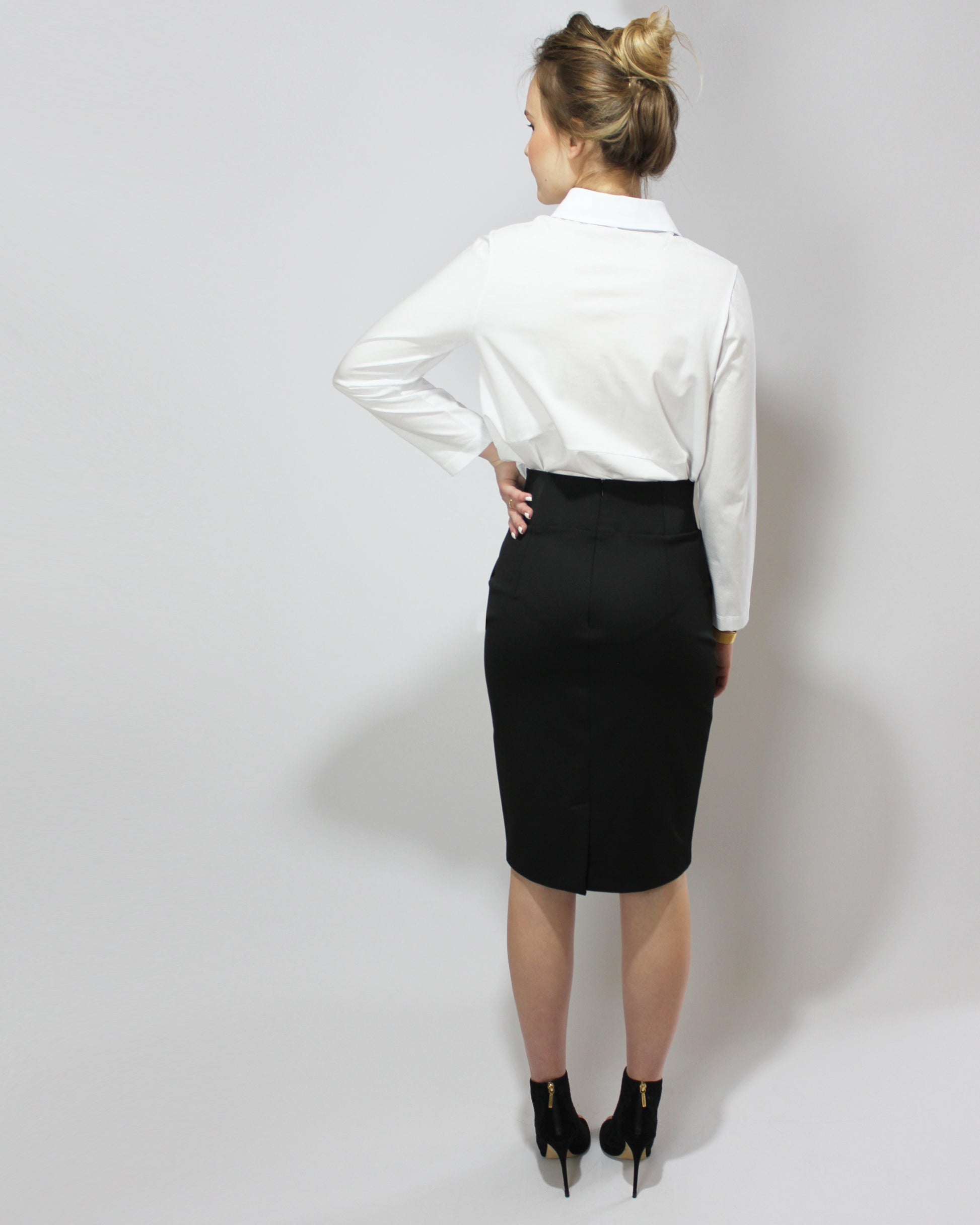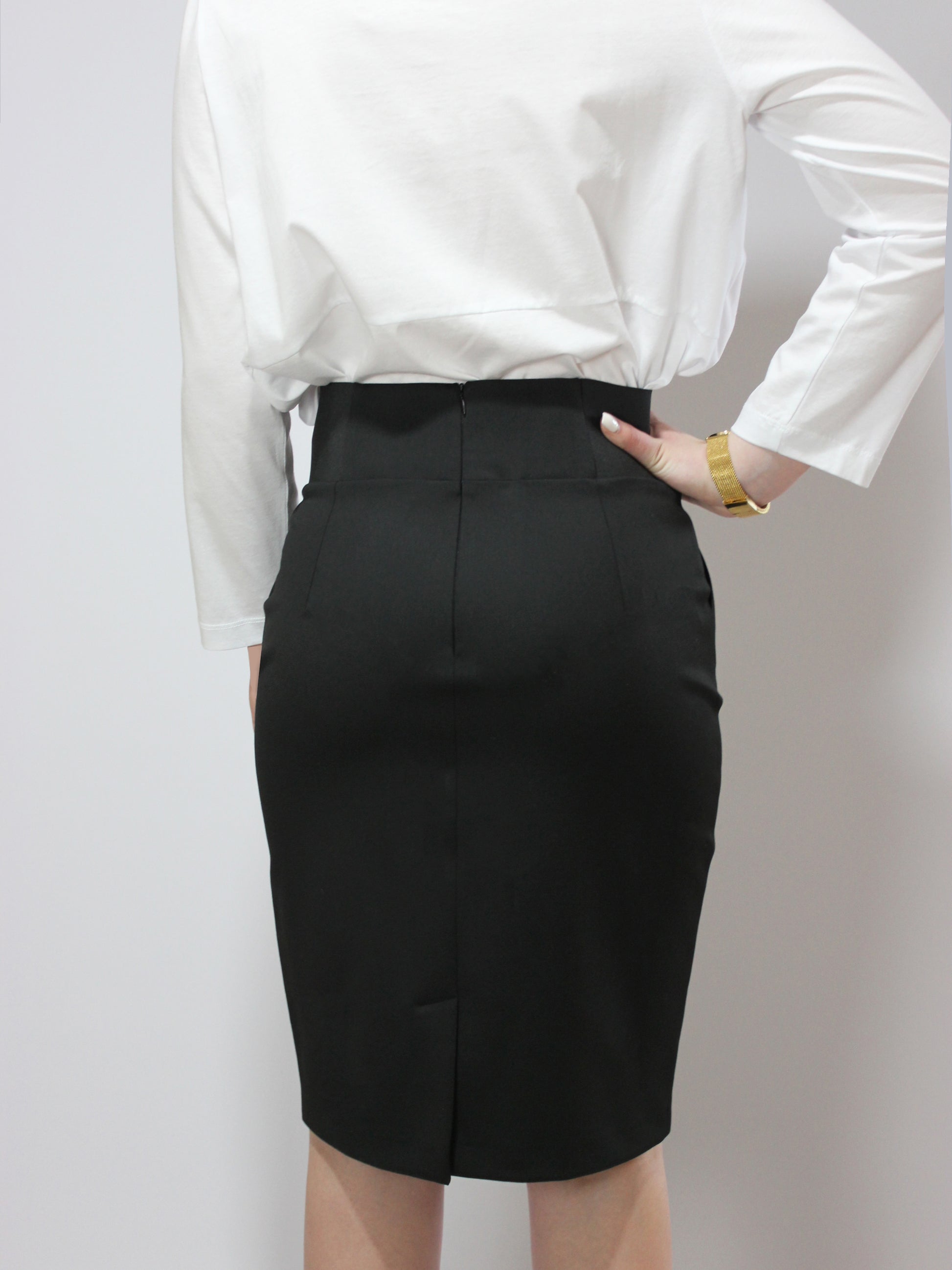 Стильная и элегантная юбка-карандаш длиной до колена с эффектом пуш-ап и эластичным вискозным материалом. Комфорт движения и идеальная посадка благодаря эластичному поясу по бокам юбки. Классическая шлица по центру спинки и два маленьких ложных кармана спереди, которые визуально придают талии диагональ, что делает ее более тонкой и элегантной.