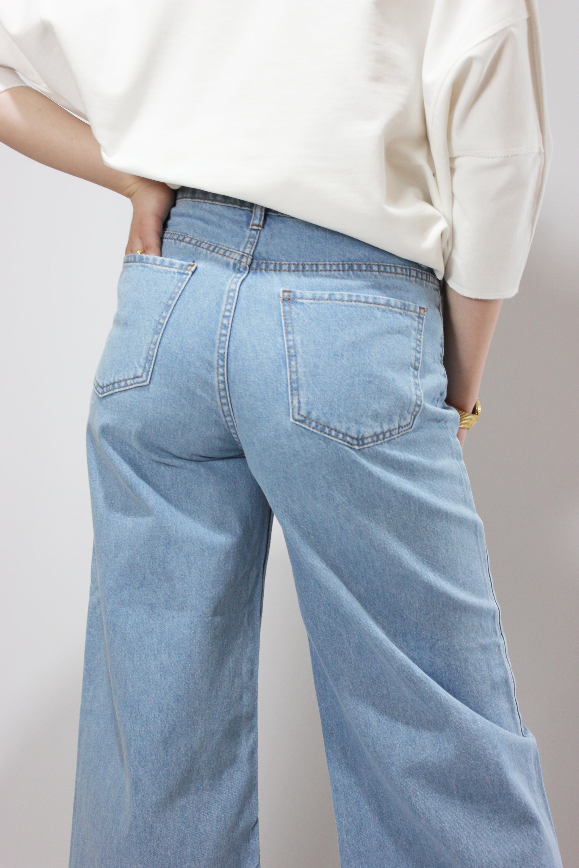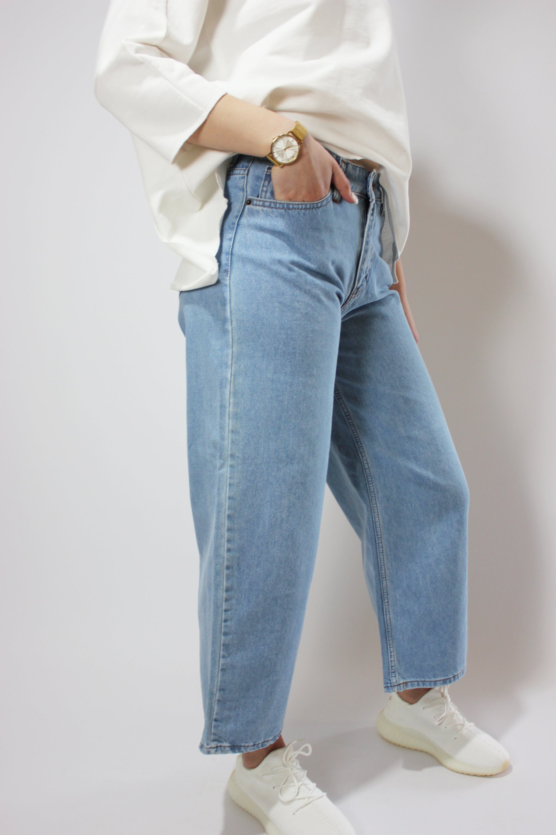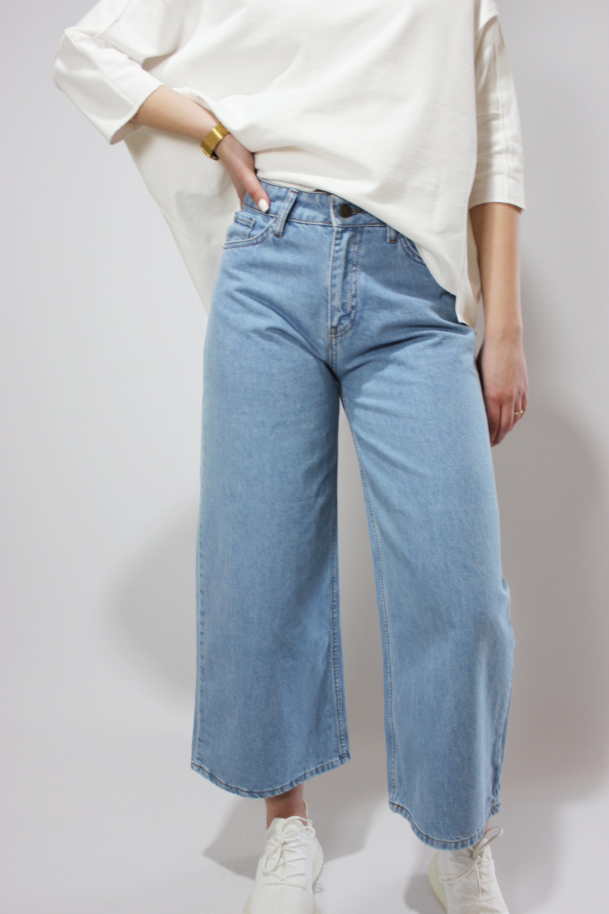 Широкий прямой фасон. Неэластичный джинсовый хлопковый материал. Высокая посадка, удобные карманы, модная длина до щиколотки.