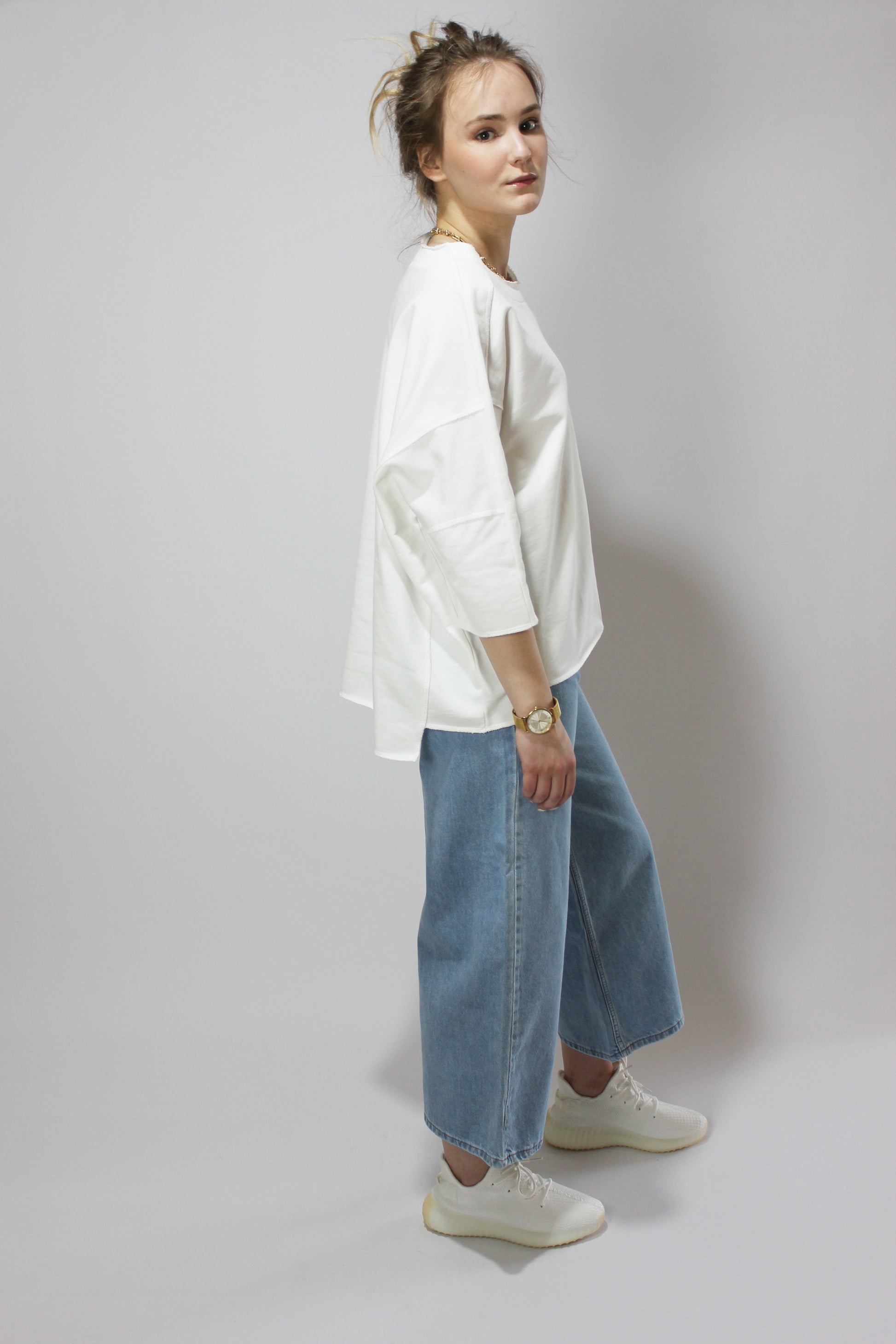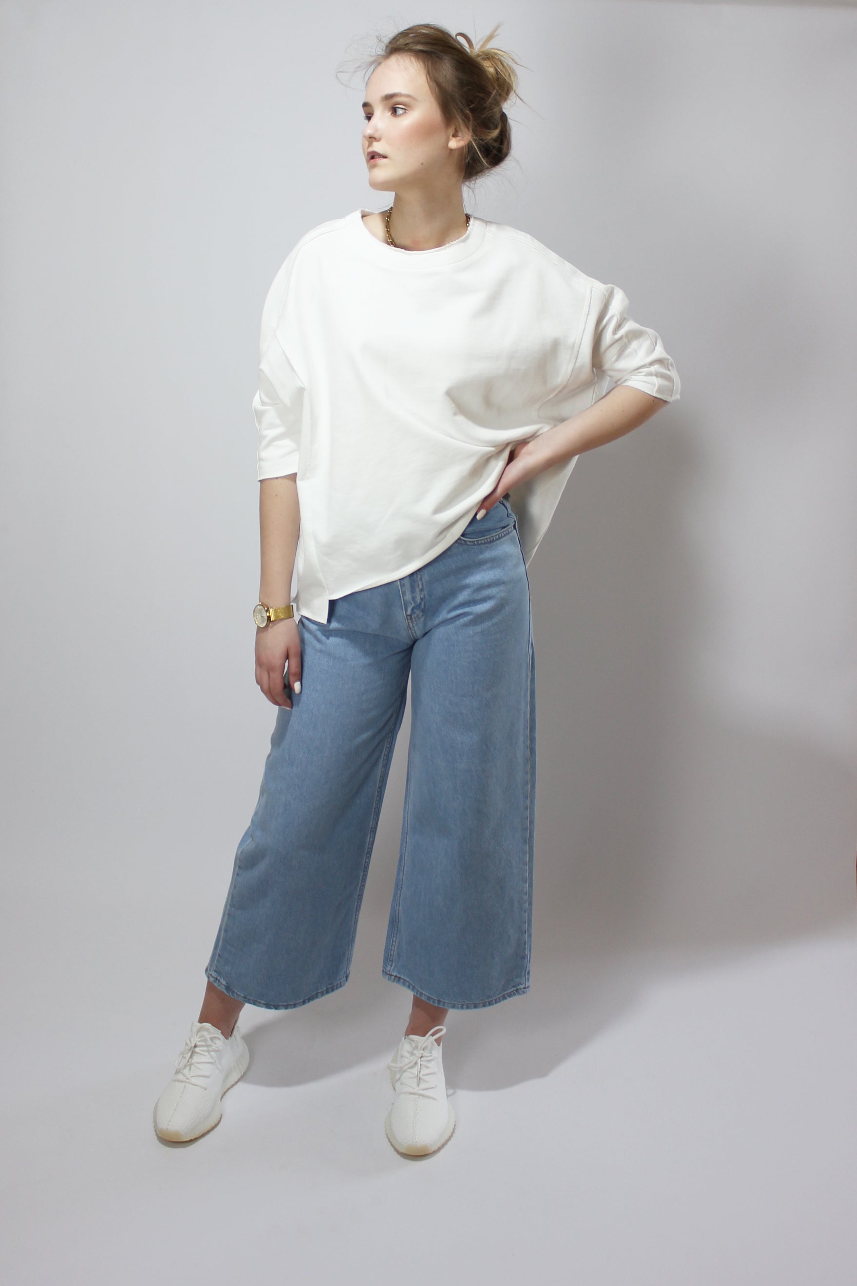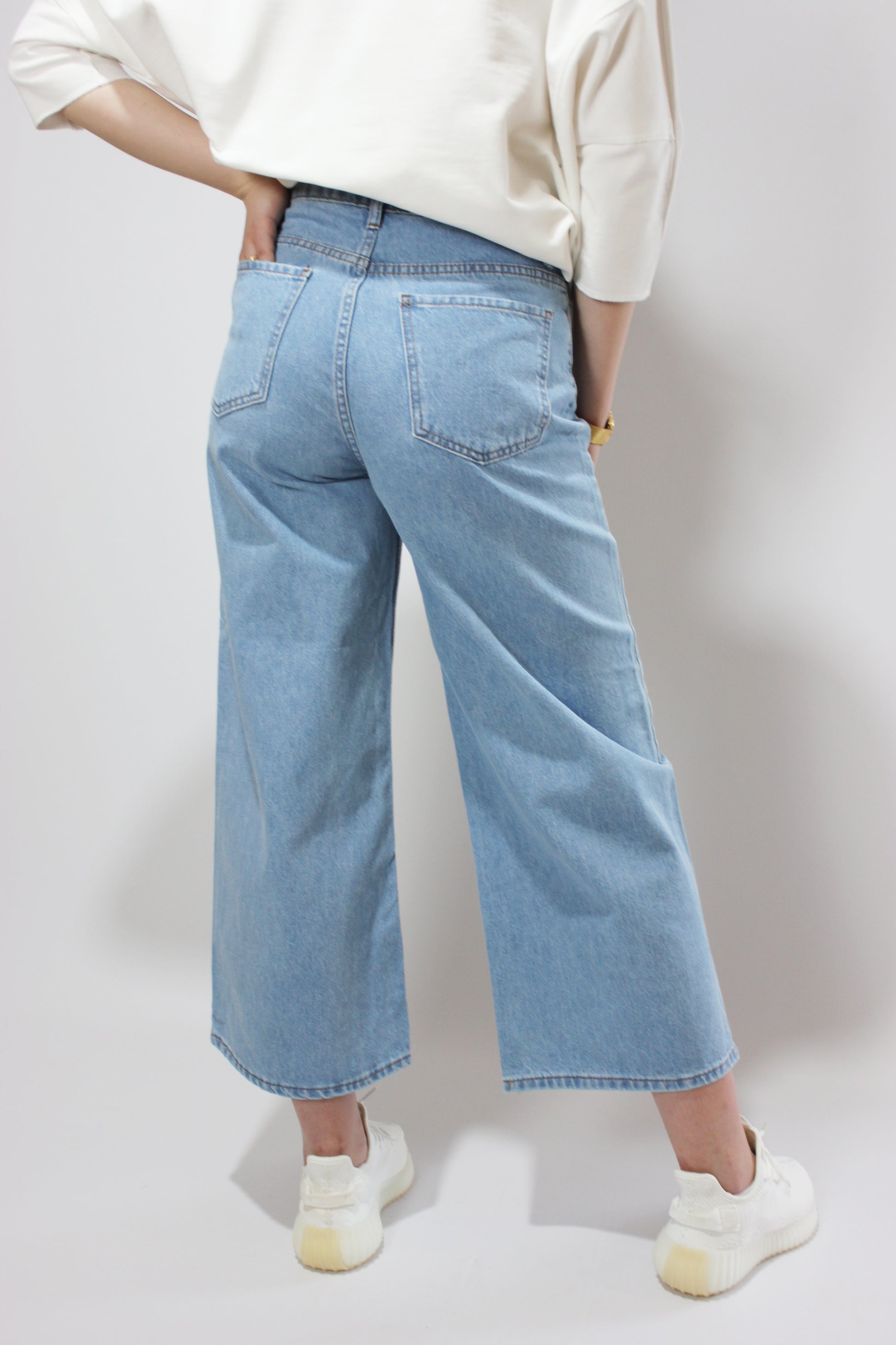 Широкий прямой фасон. Неэластичный джинсовый хлопковый материал. Высокая посадка, удобные карманы, модная длина до щиколотки.