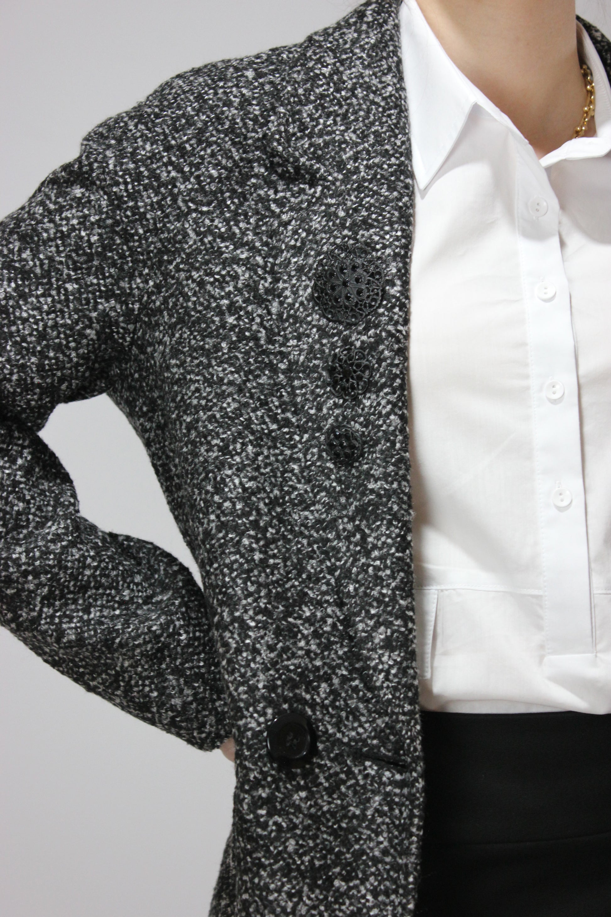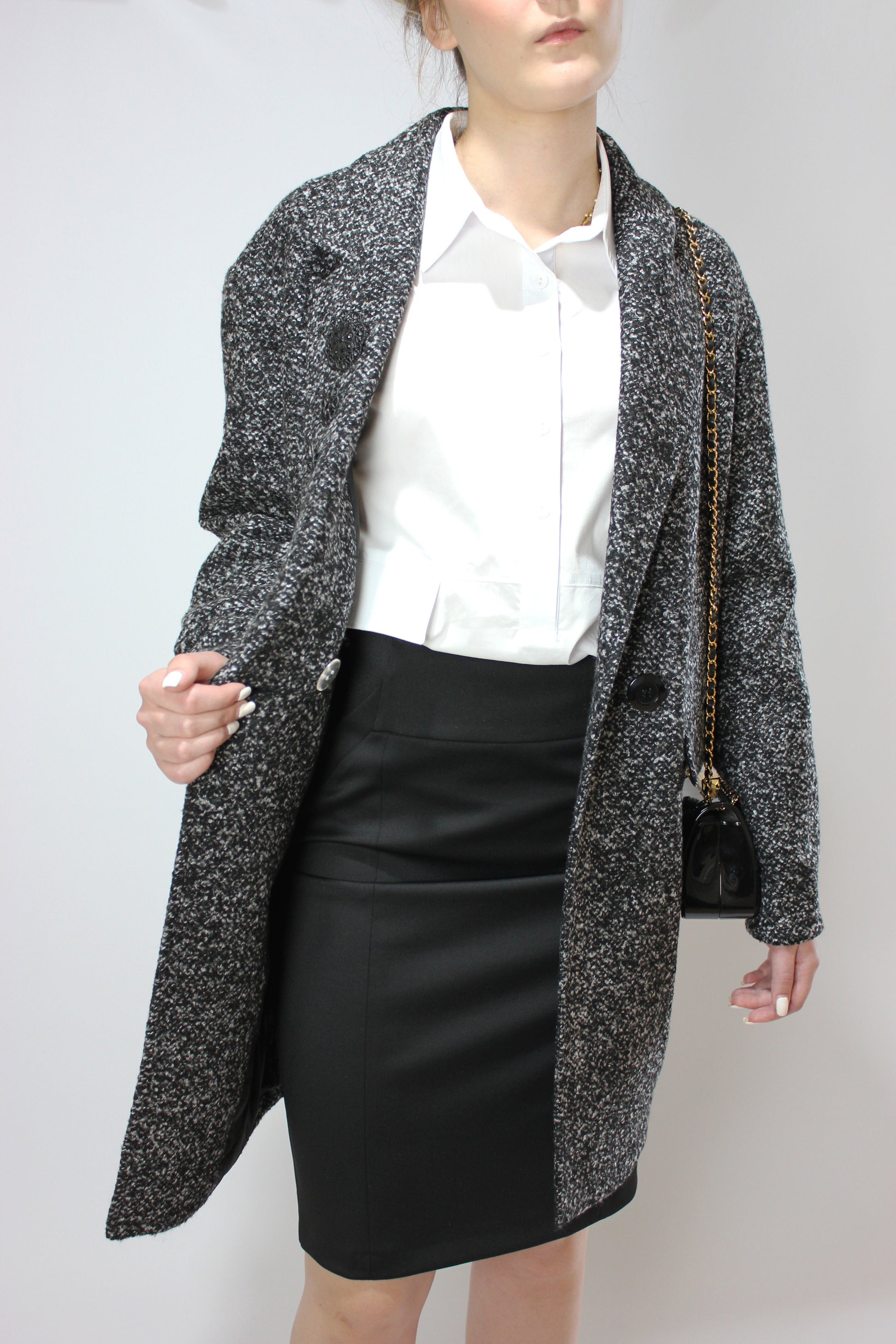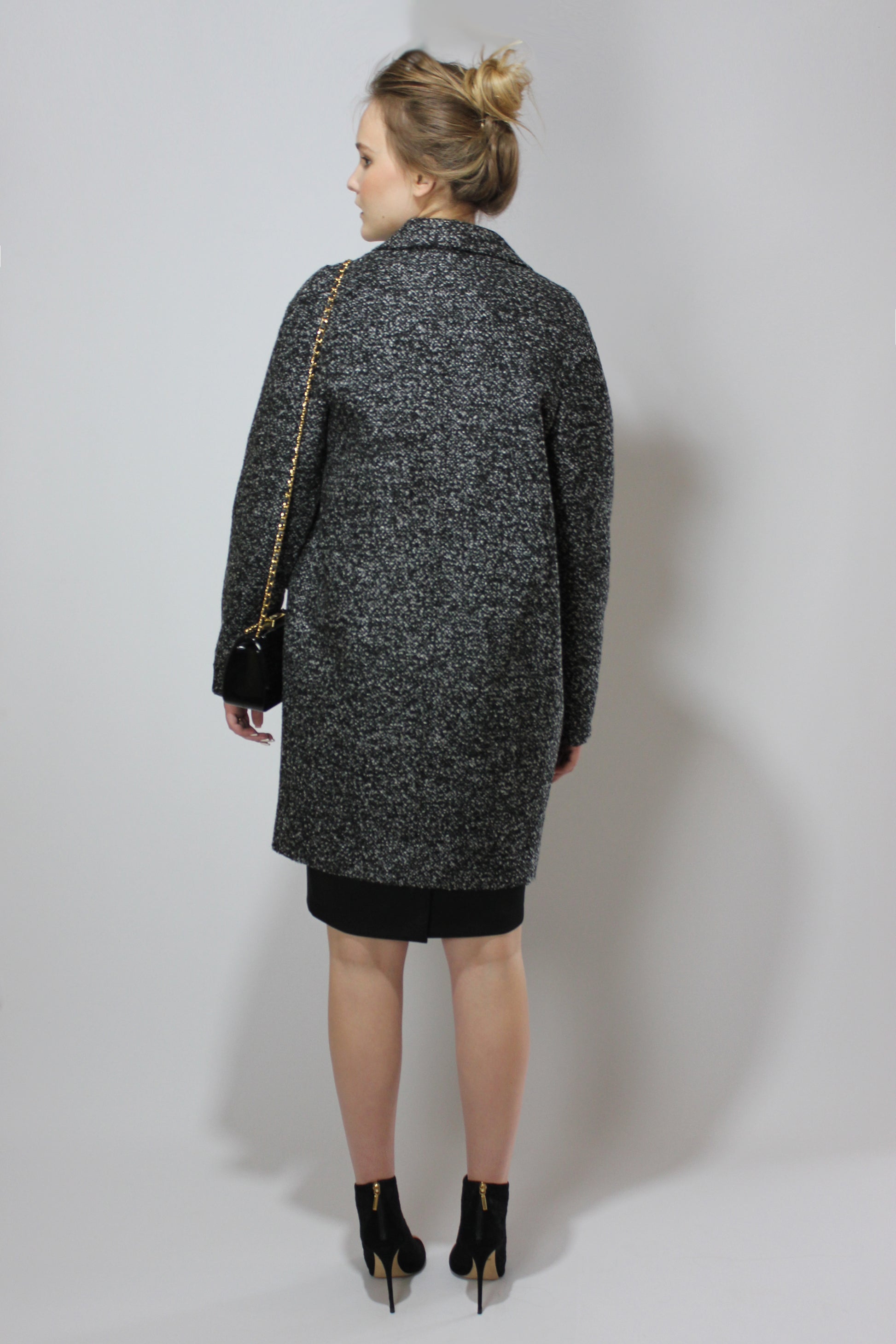 Элегантный свободный фасон кокона, длинный рукав реглан. Воротник с лацканами, двубортный с одним рядом пуговиц. Теплый мягкий материал букле.
