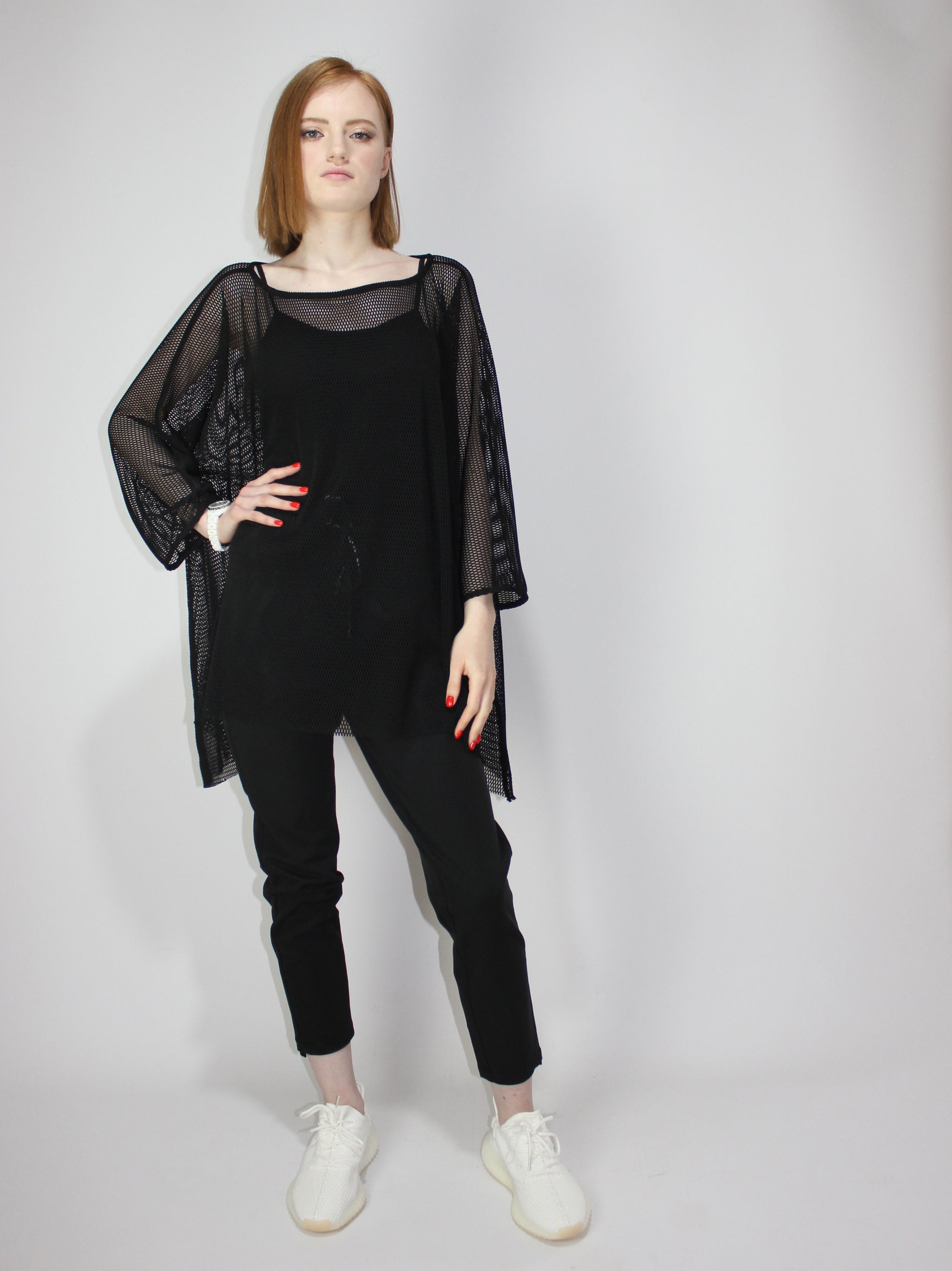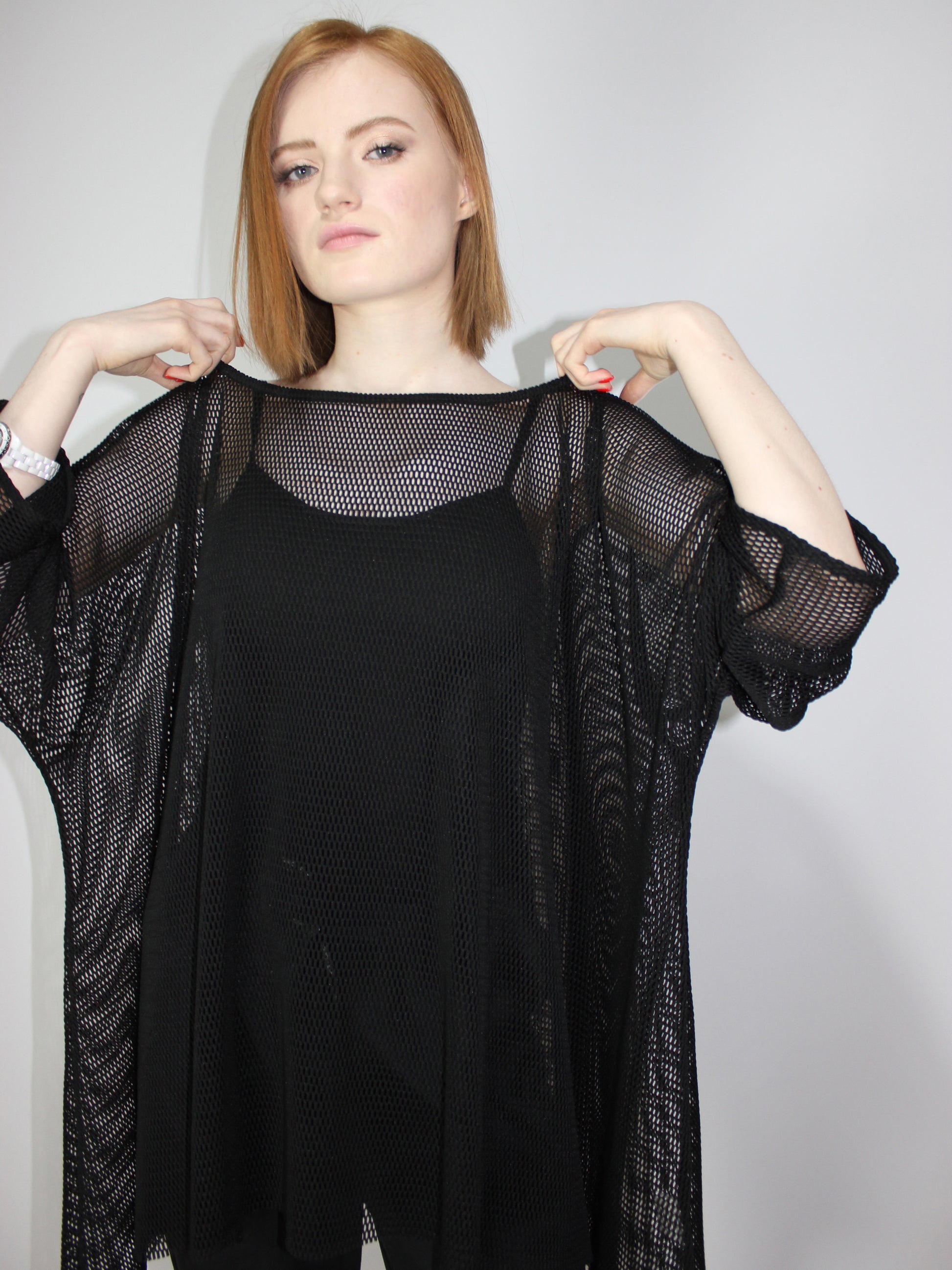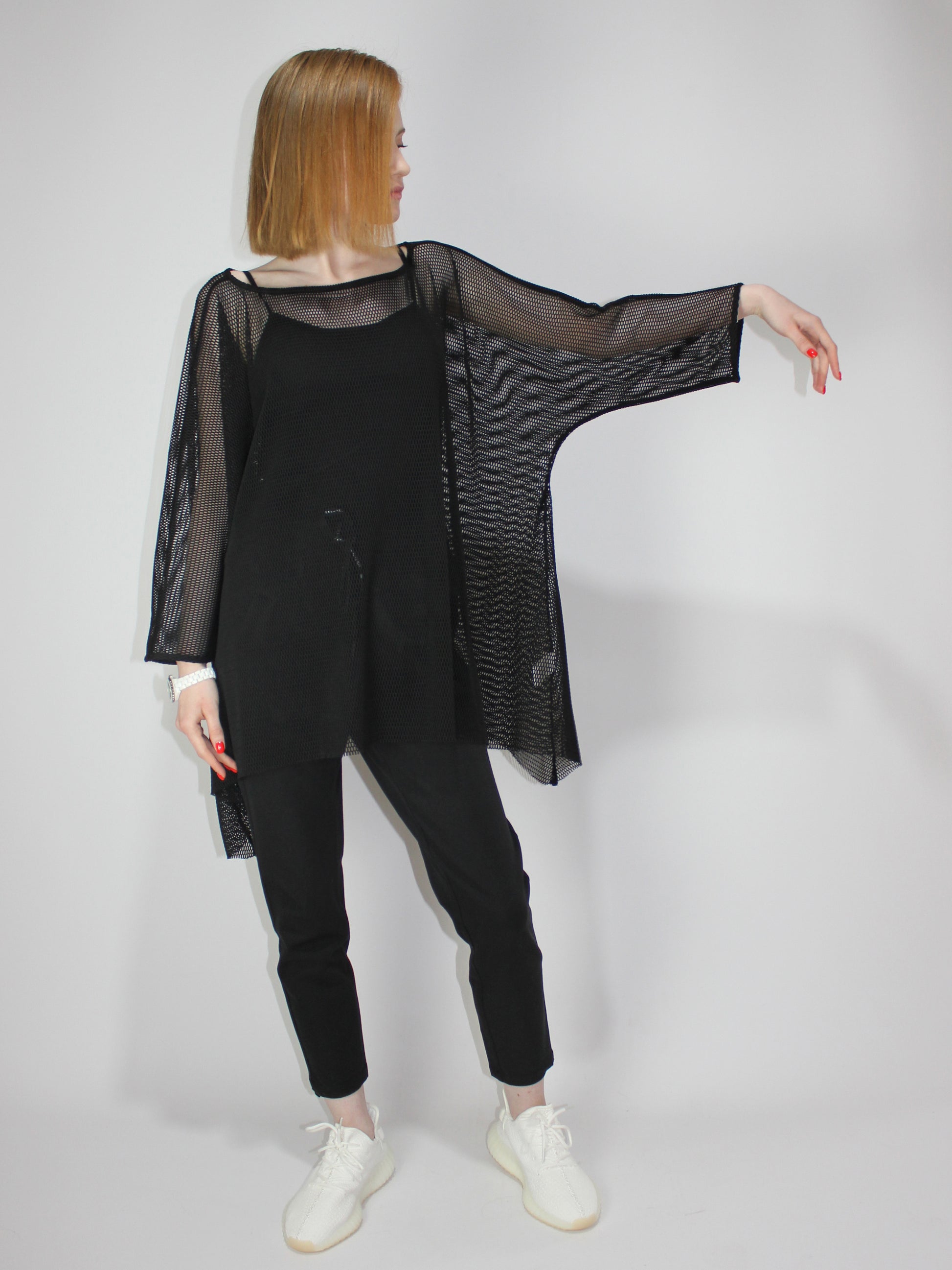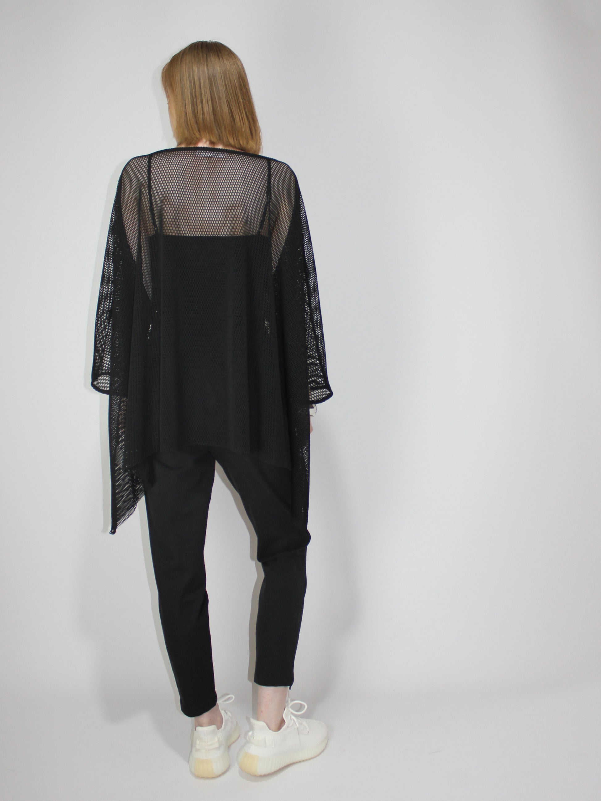 Черная легкая итальянская сетка высокого качества с цельным рукавом, свободный свободный крой. Разработан в 1 размере для всех типов телосложения. Идеально подходит для ношения со спортивной майкой под ней или поверх элегантного платья в качестве накидки.