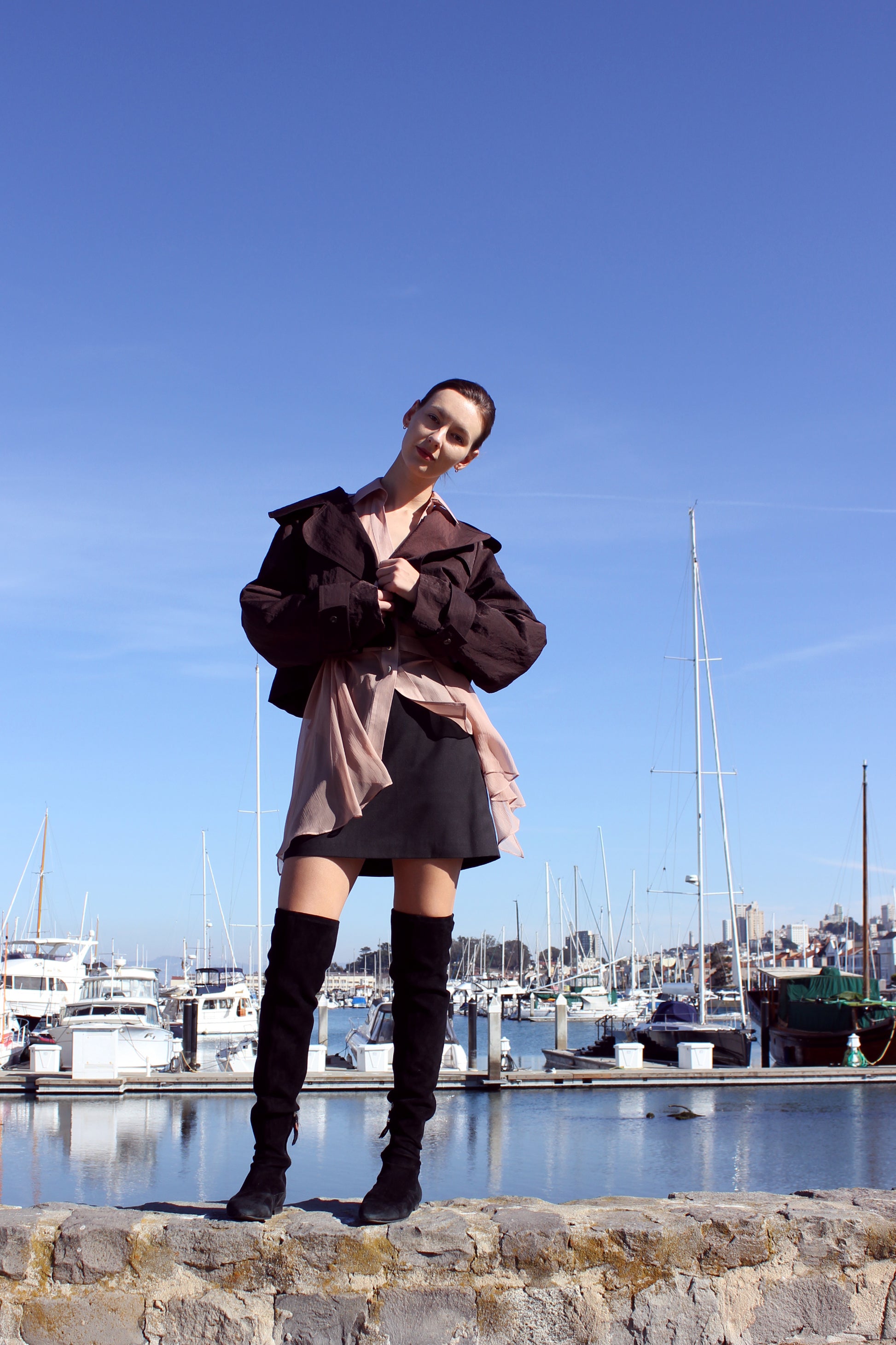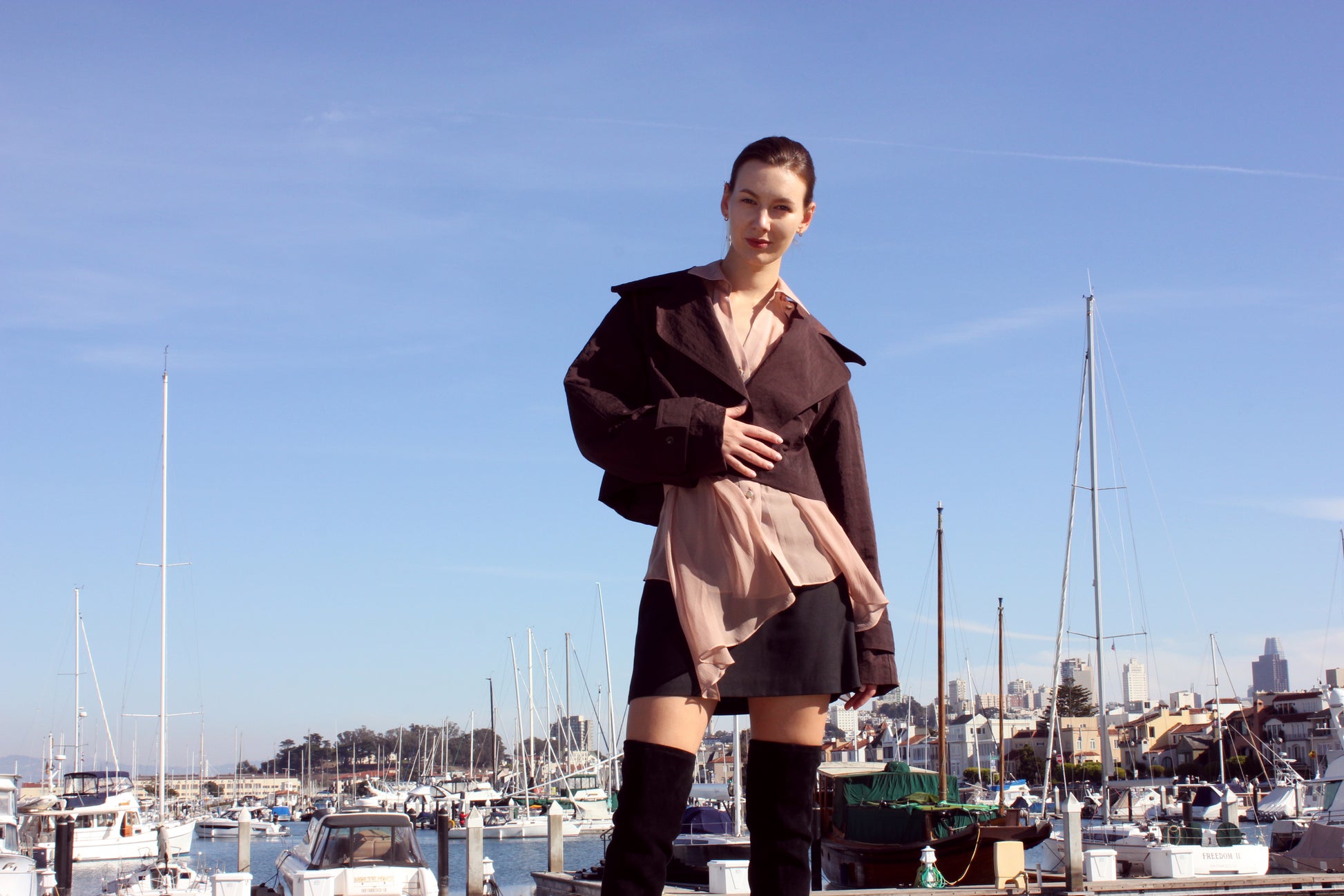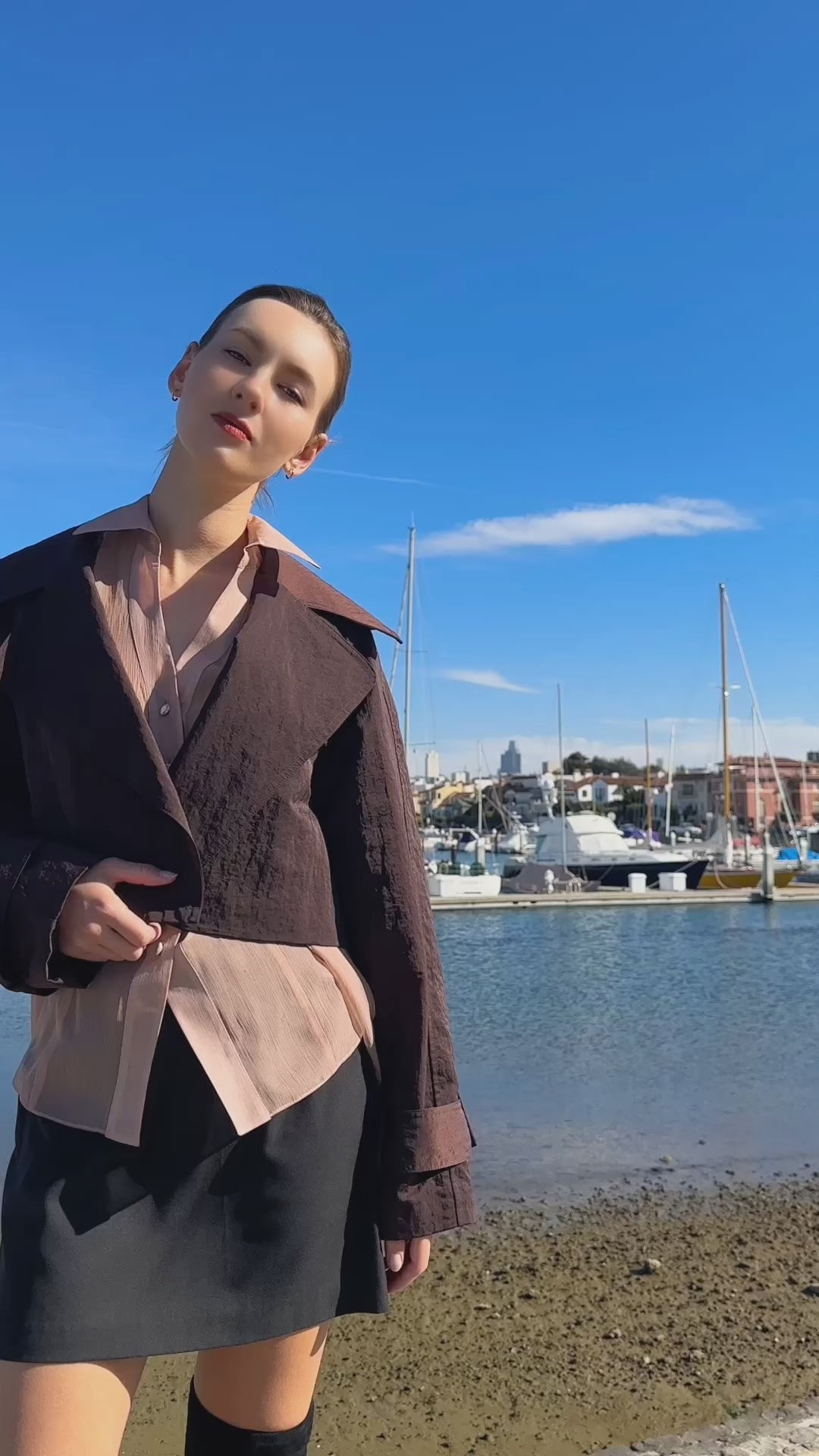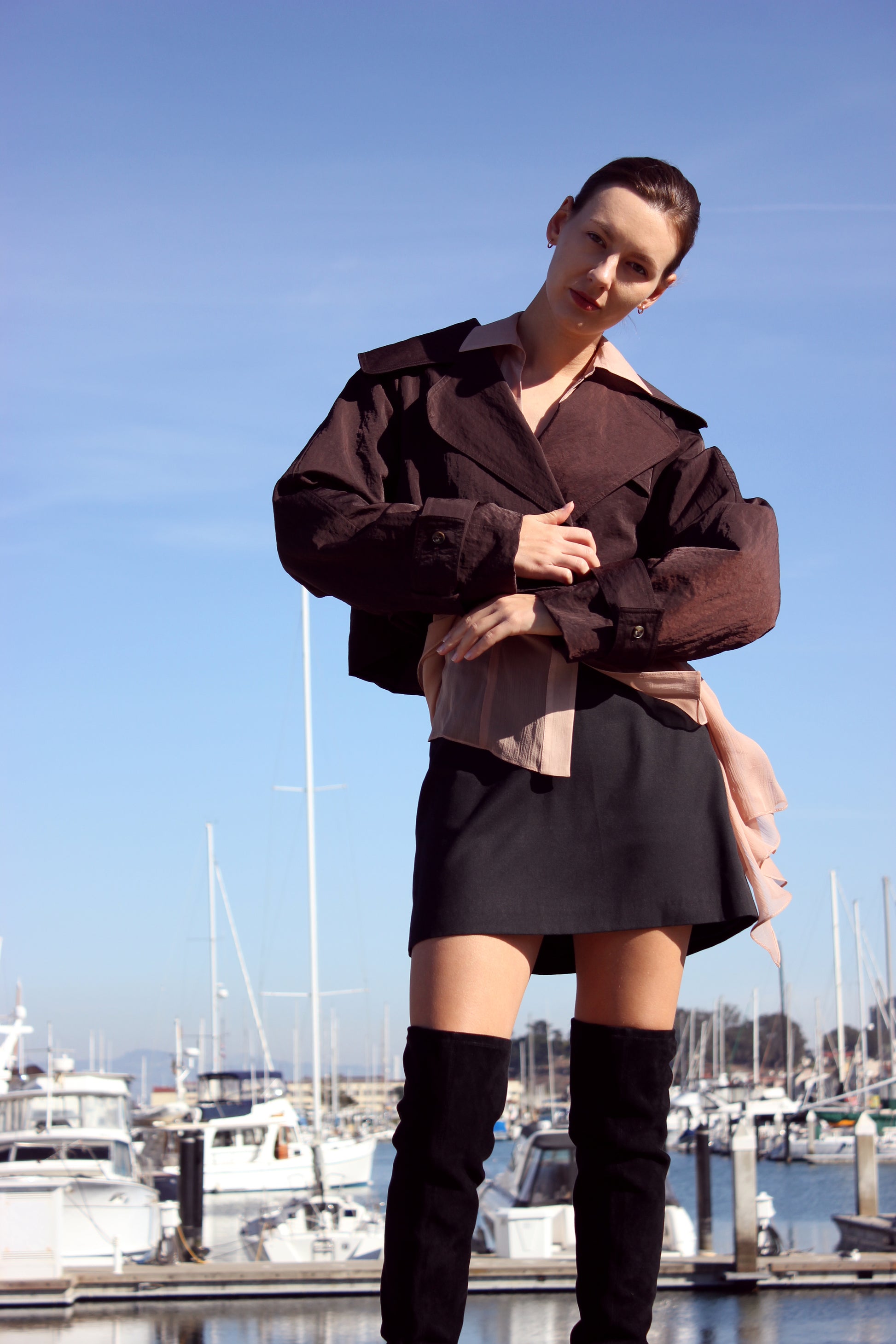 Featuring a trendy chocolate brown color, this waist-length Mini Trench Coat combines a luxurious taffeta material with a warm soft feel. Its wide lapel and raglan sleeves give it an oversized fit, adding to its elegant and exclusive style.