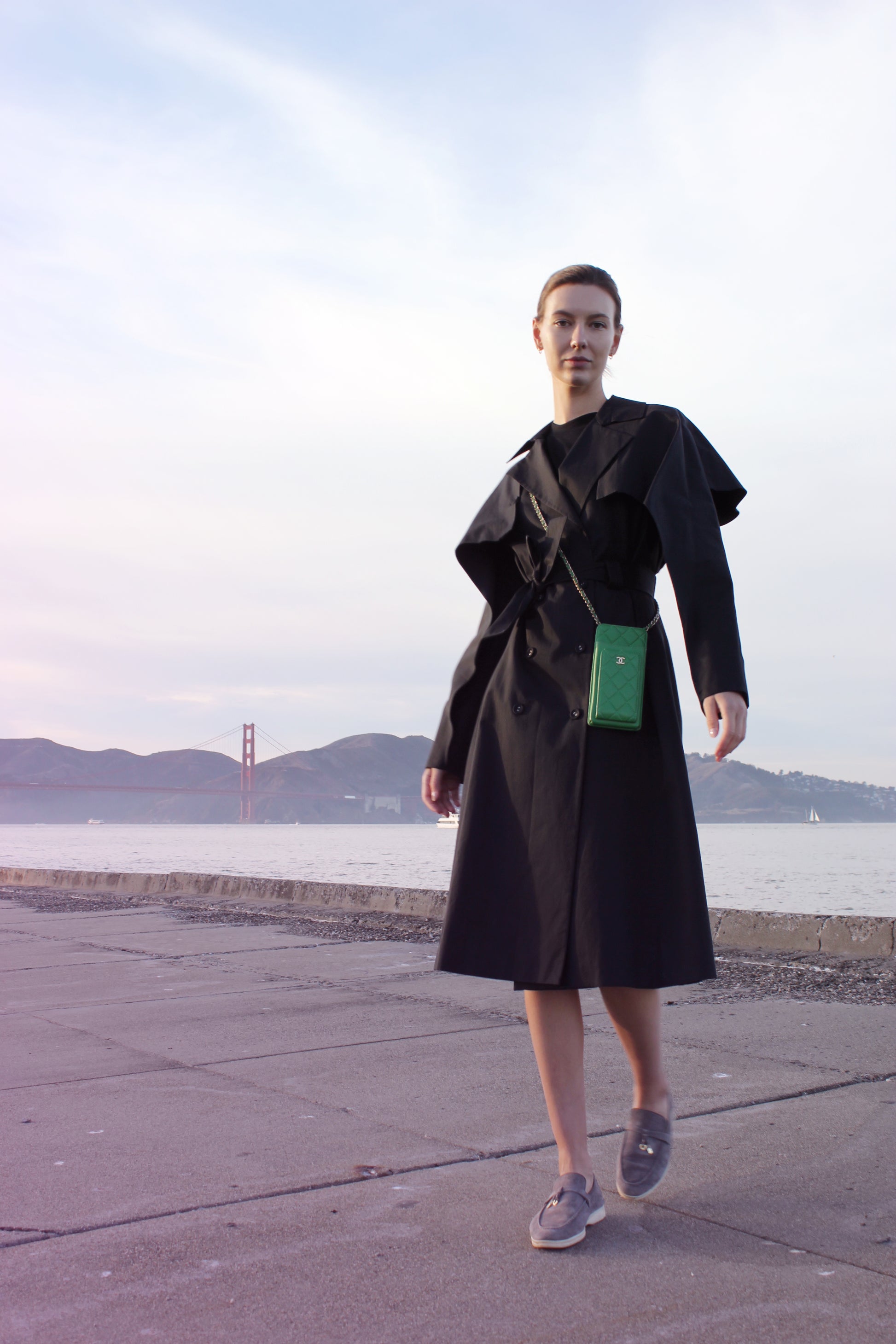 100% Cotton gabardine Trench Coat with Back and front floating yoke detail, double breasted, back slit opening with buttons, side pockets.
