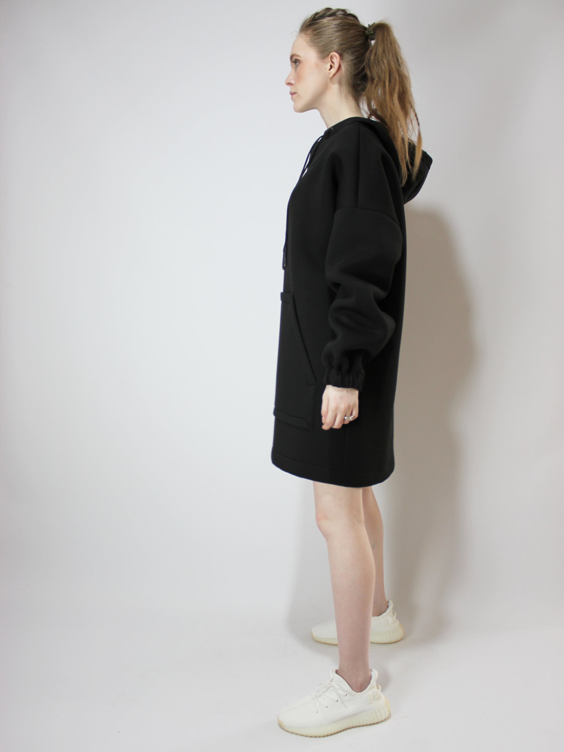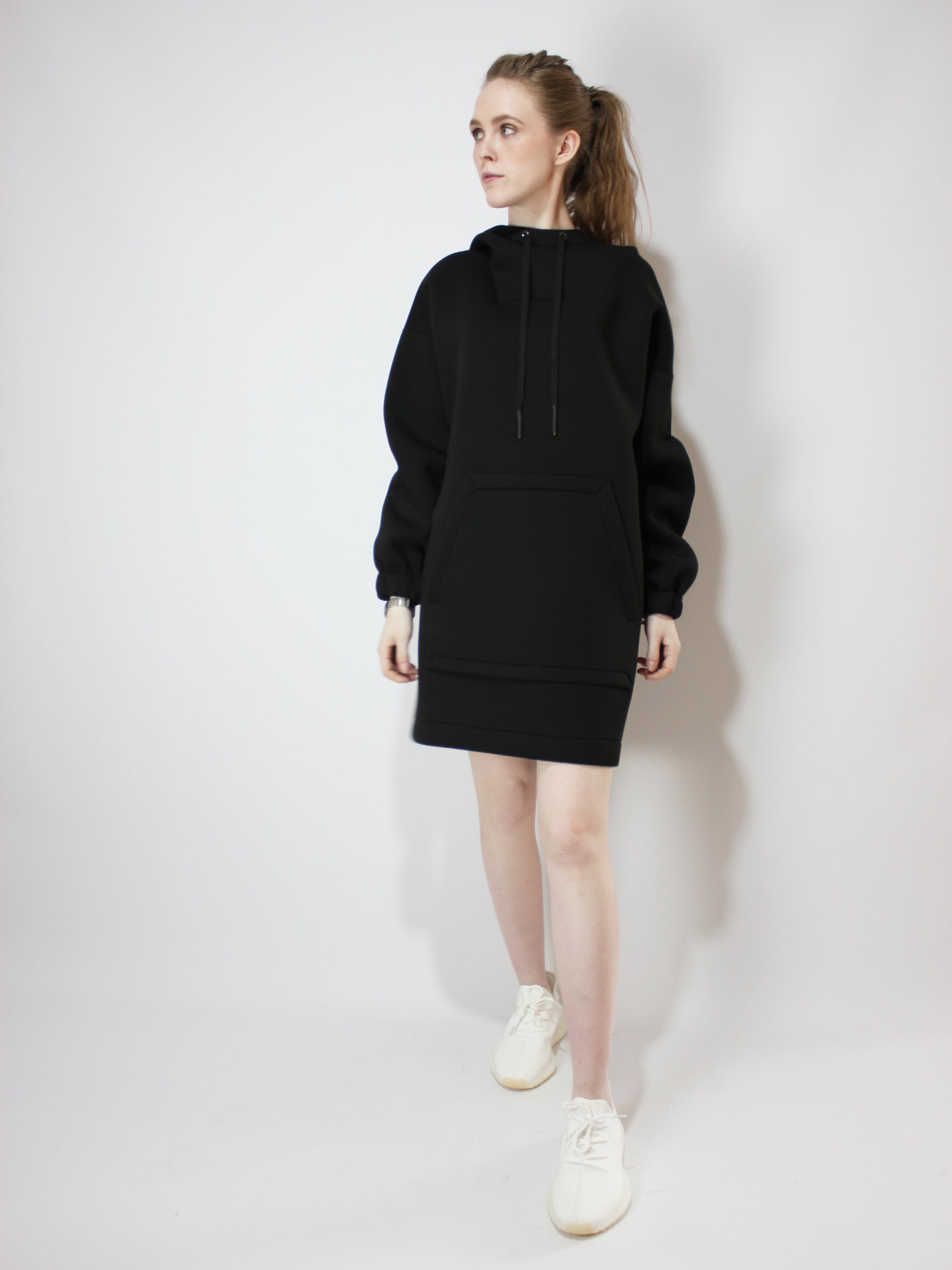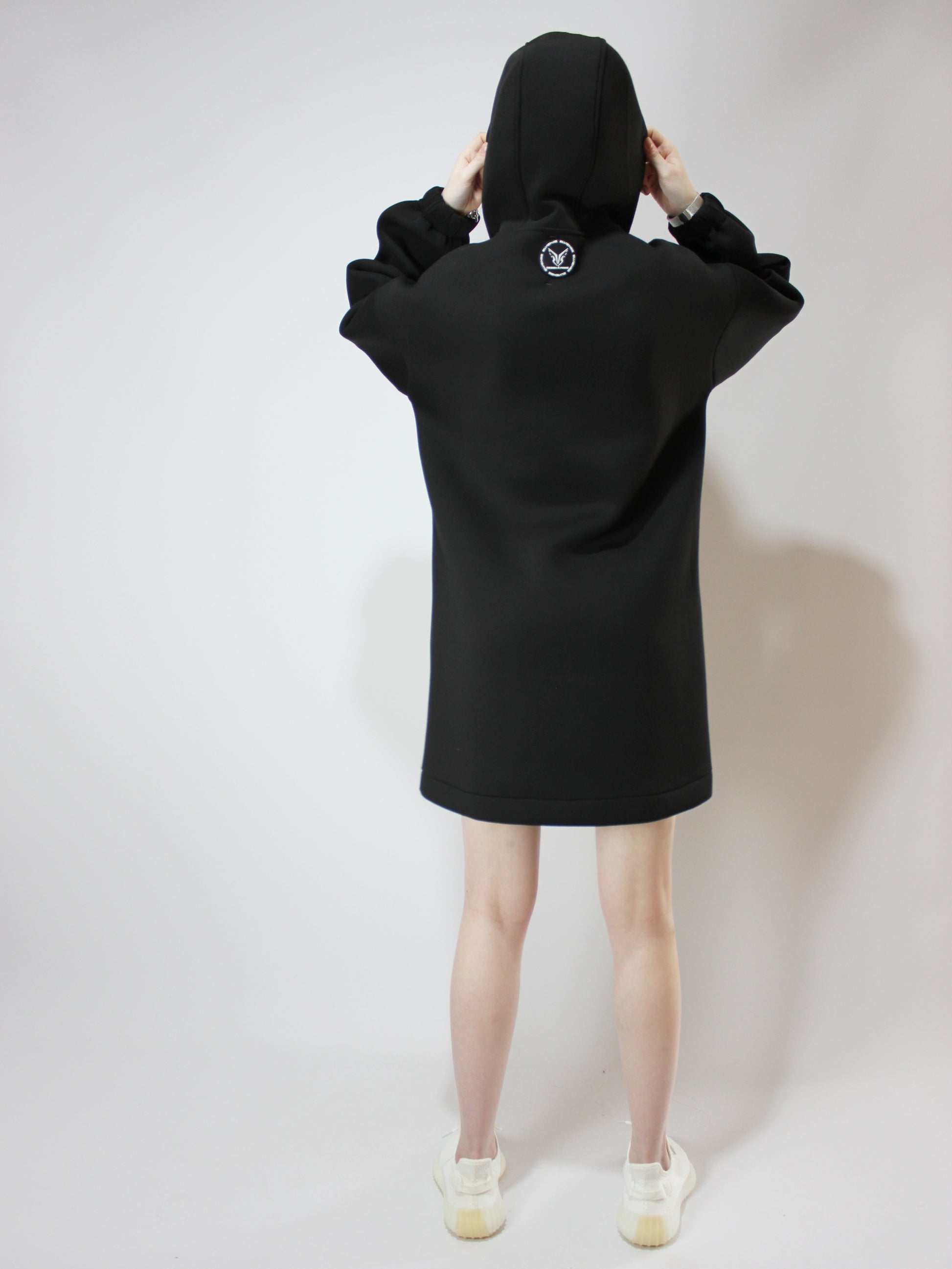 Свободный крой - стильное платье одного размера с большими удобными карманами спереди. Черный резиновый логотип ELVIENSE Paris на спине.