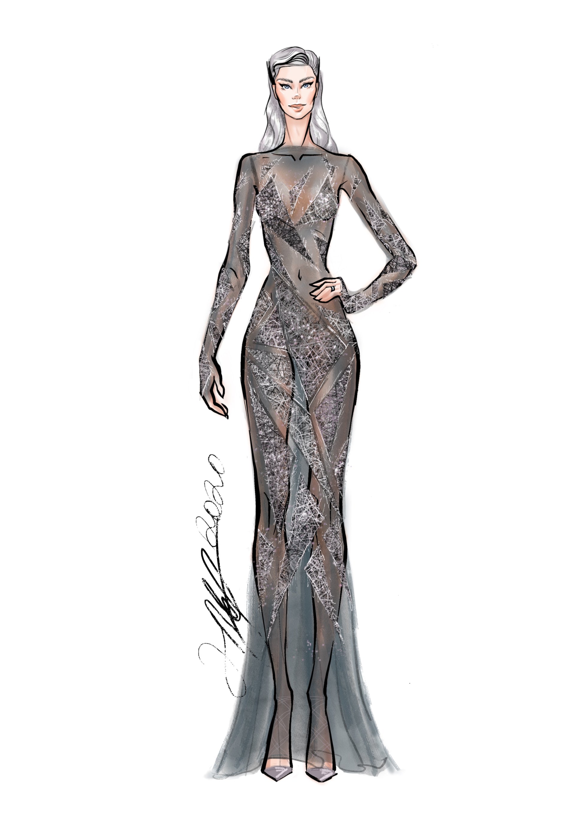 Вечернее платье силуэта «русалка» с эффектом мокрого платья. Серебристые жаккардовые вышитые треугольники на черной сетке. Открытая спина, длинные рукава и длина макси. Прямой силуэт.