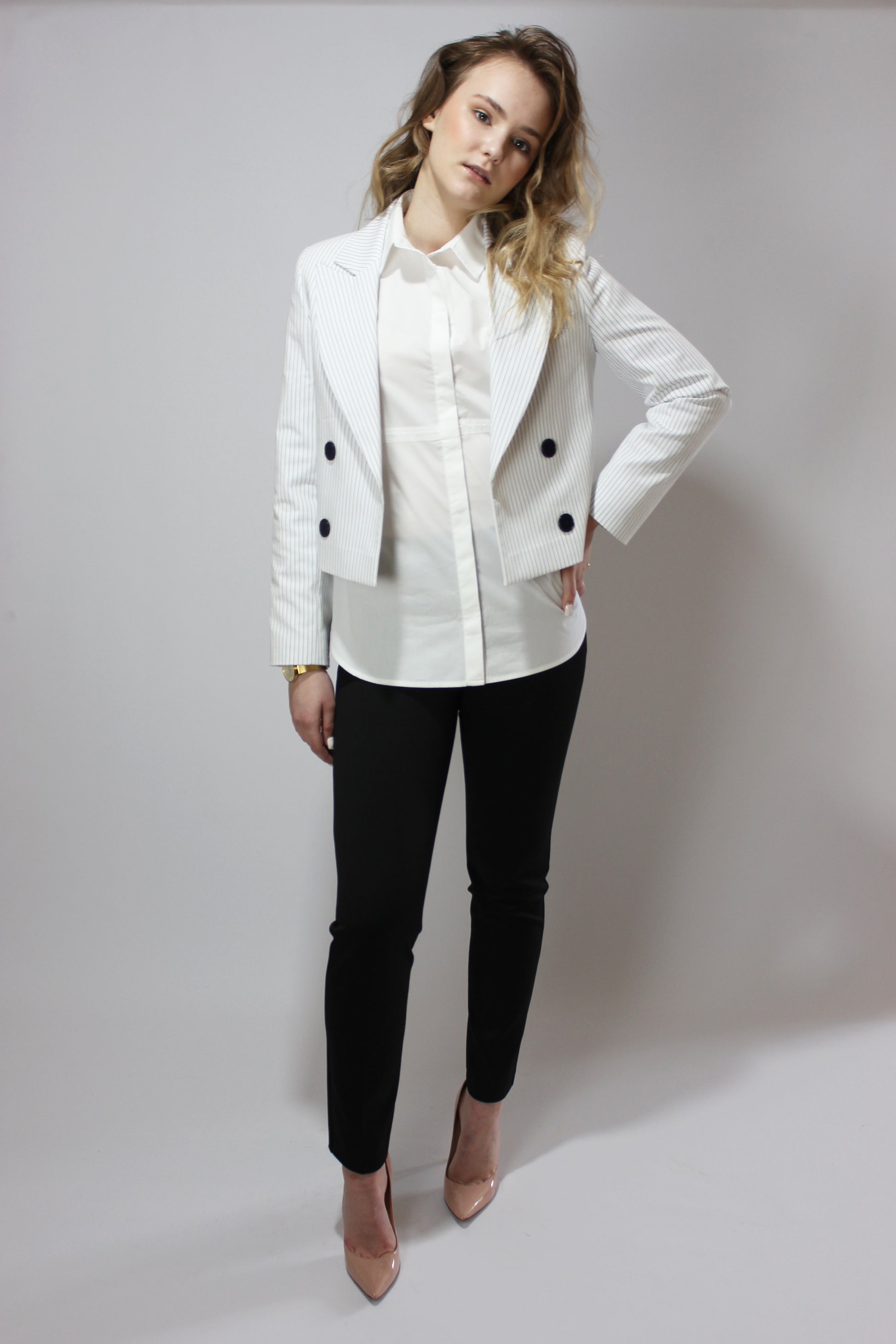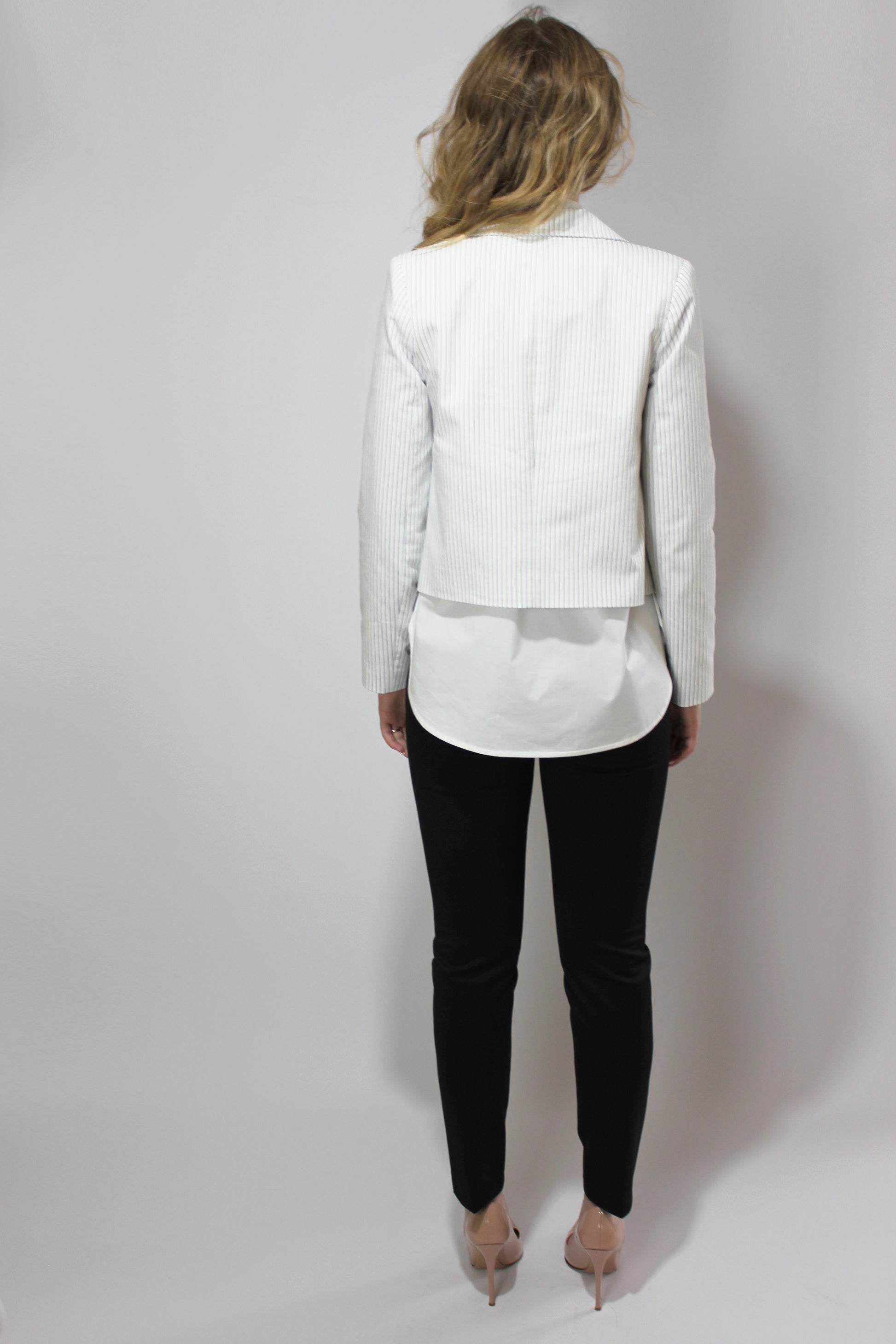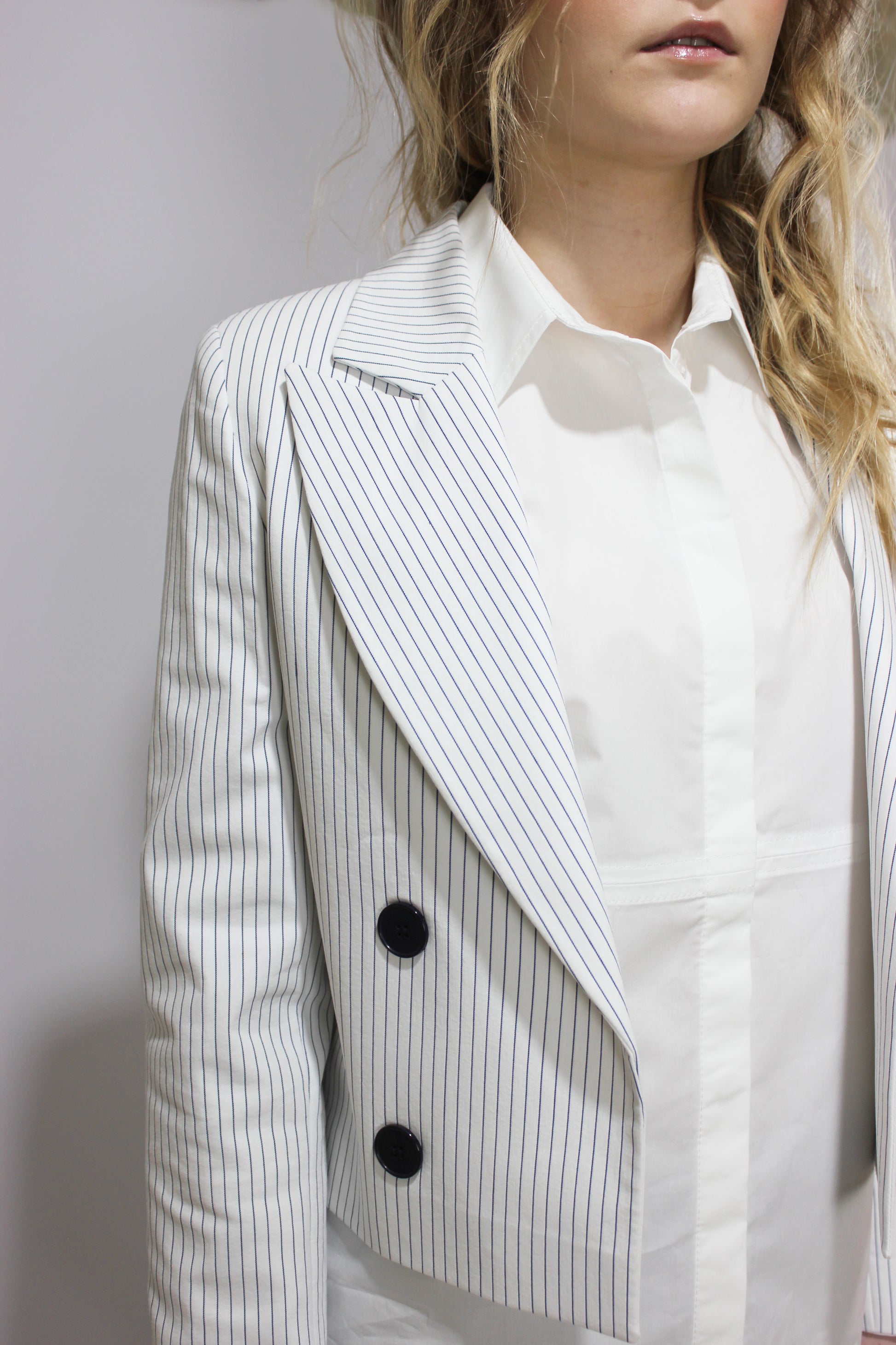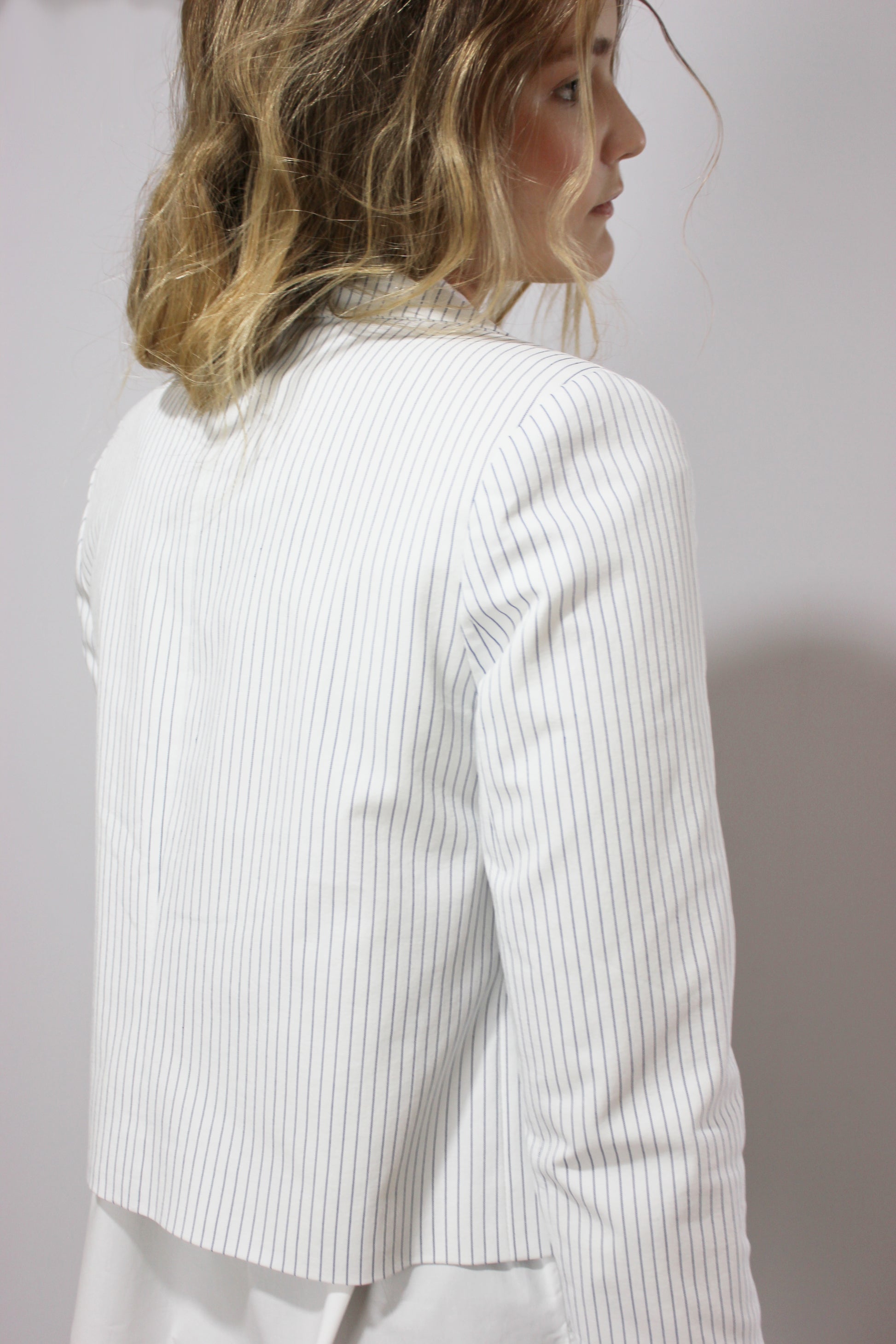 Идеальный летний хлопковый пиджак с большим элегантным лацканом, темно-синими пуговицами и тонкими синими полосками. Декоративные пуговицы, пиджак предназначен для ношения расстегнутым. Укороченная длина, длинные рукава, без карманов.