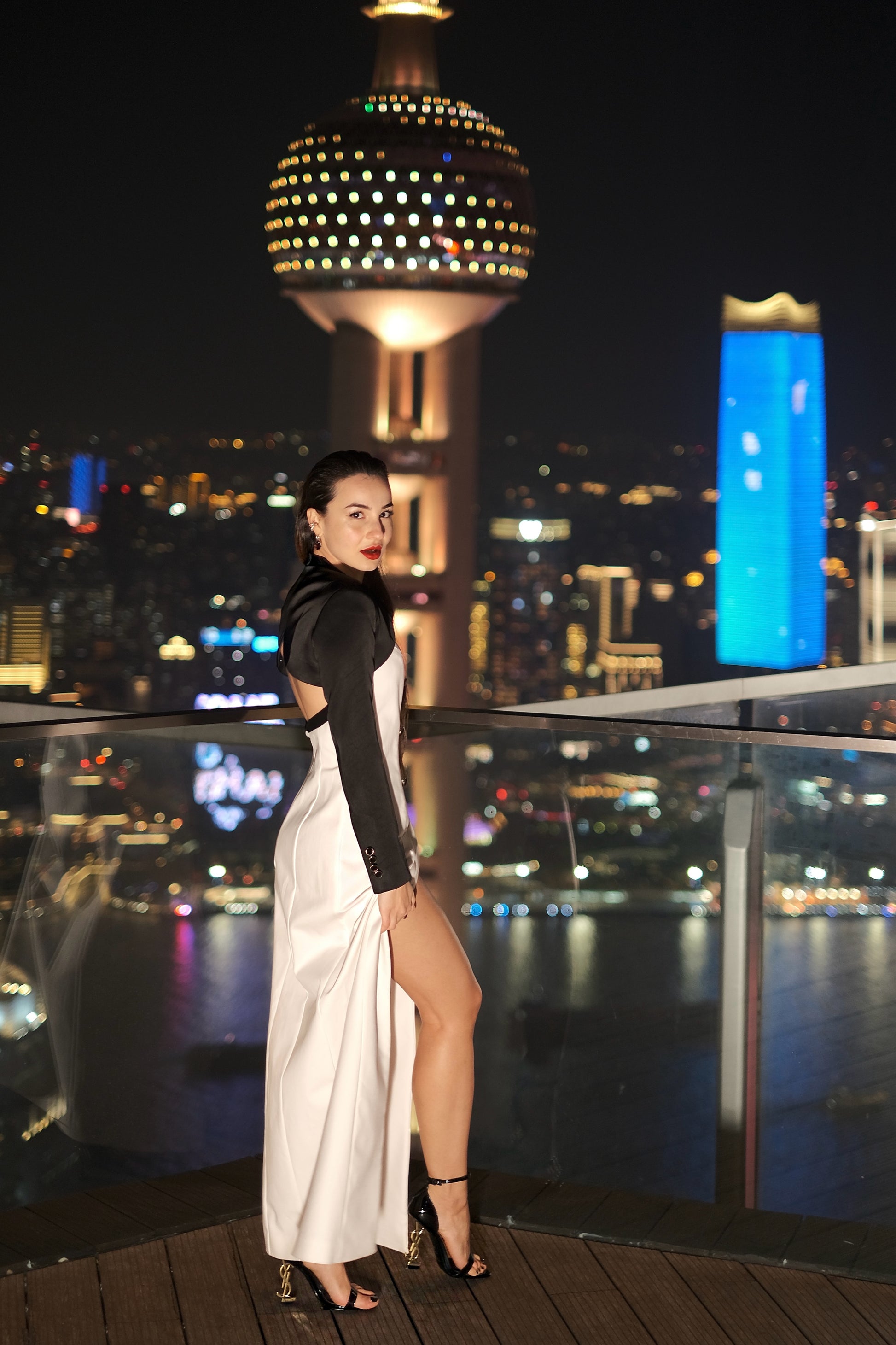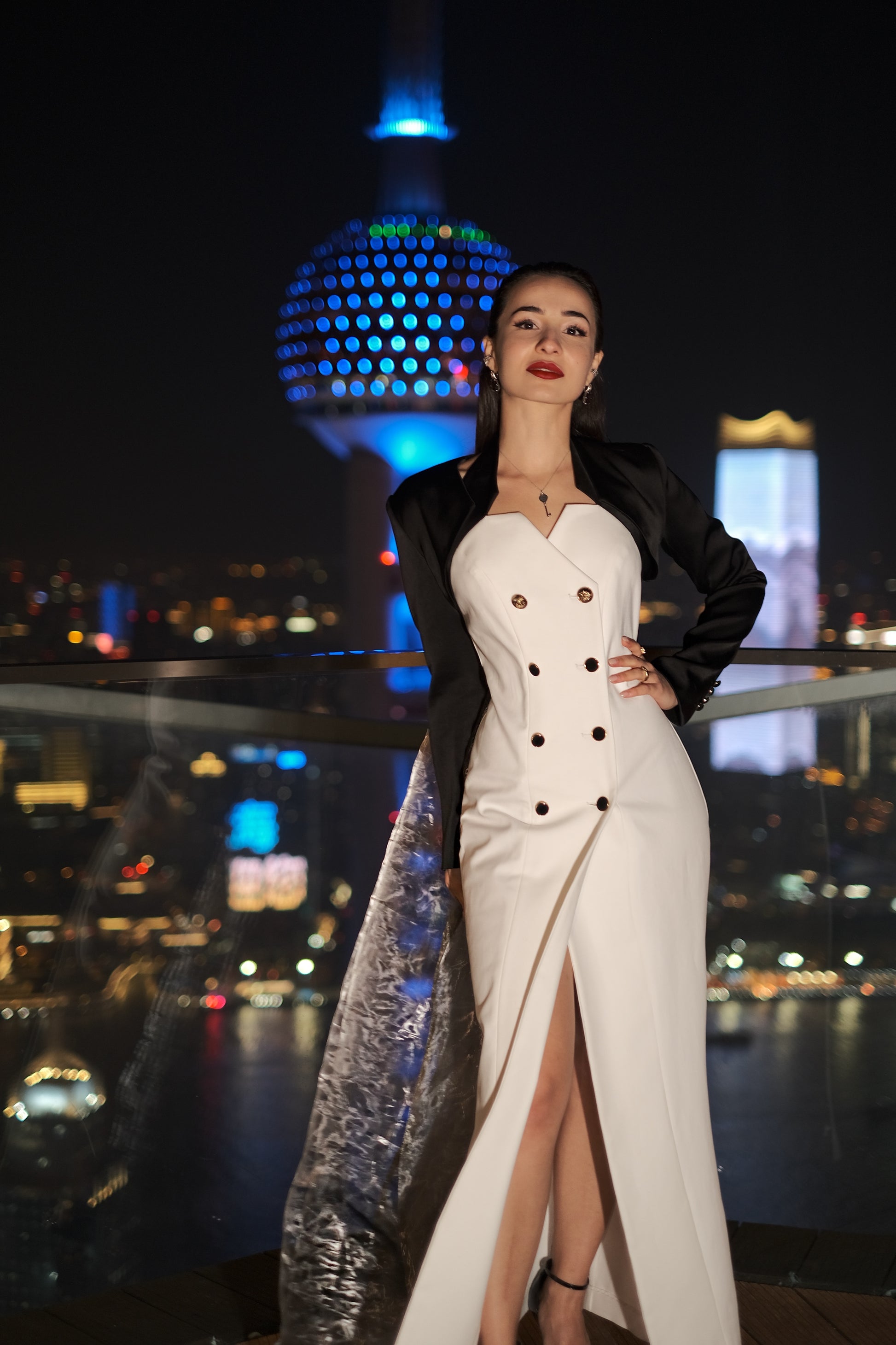 Мини-жакет со съемной легкой органзовой длинной накидкой и безрукавным двубортным длинным платьем. Нежная накидка развевается на ветру с невероятным видом на центр Шанхая и городские огни.