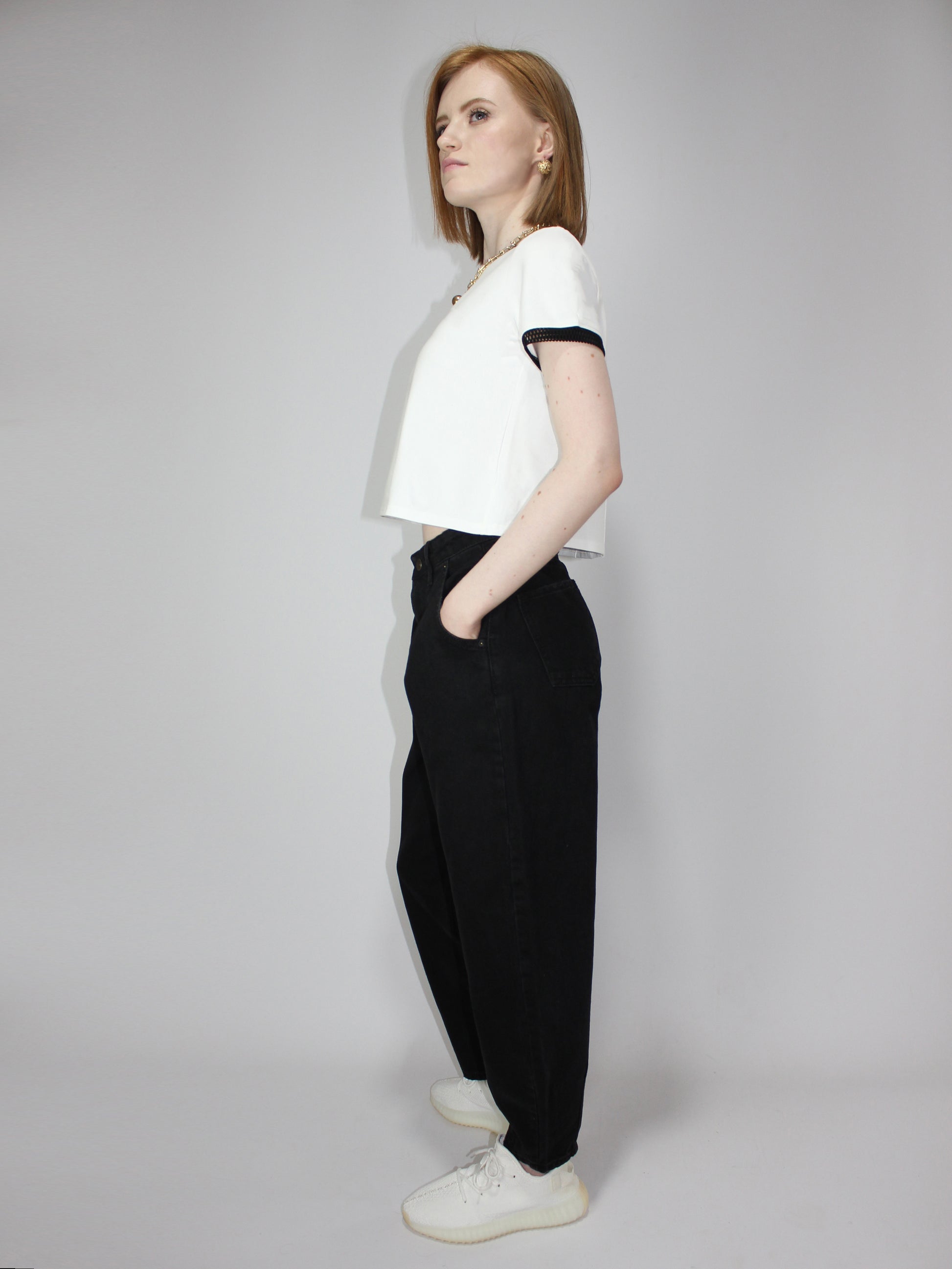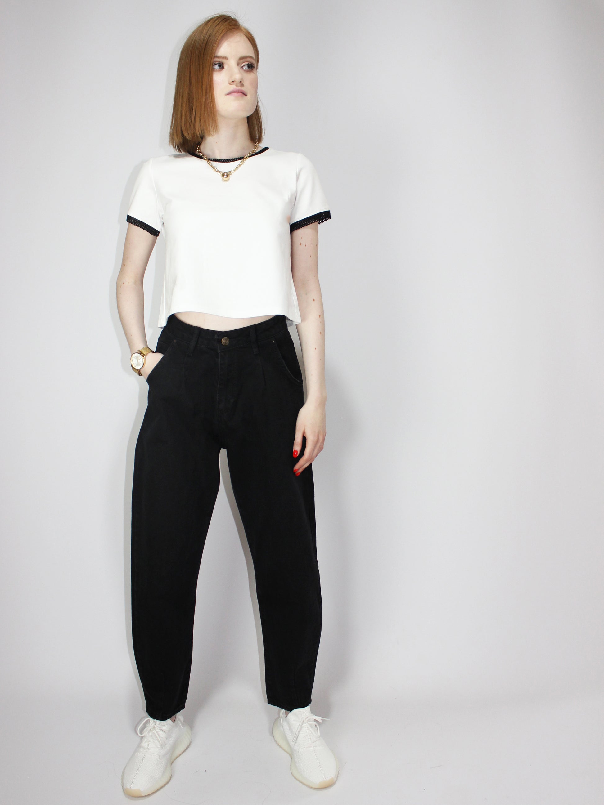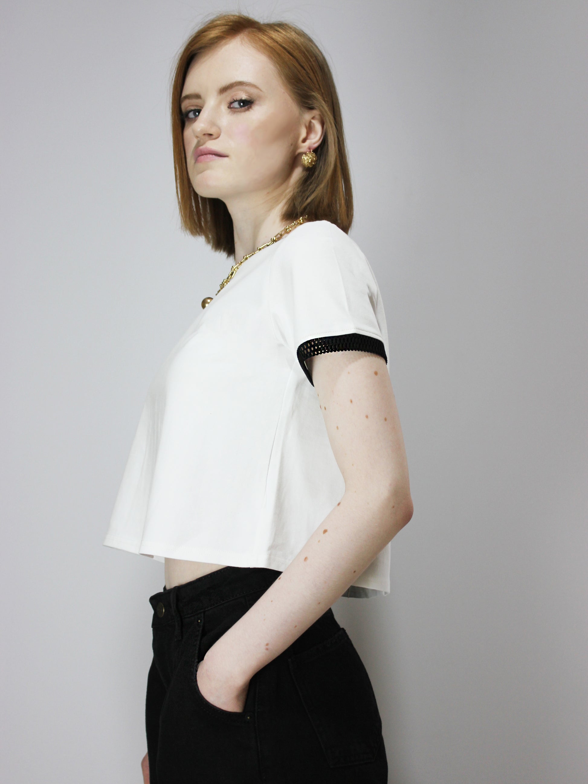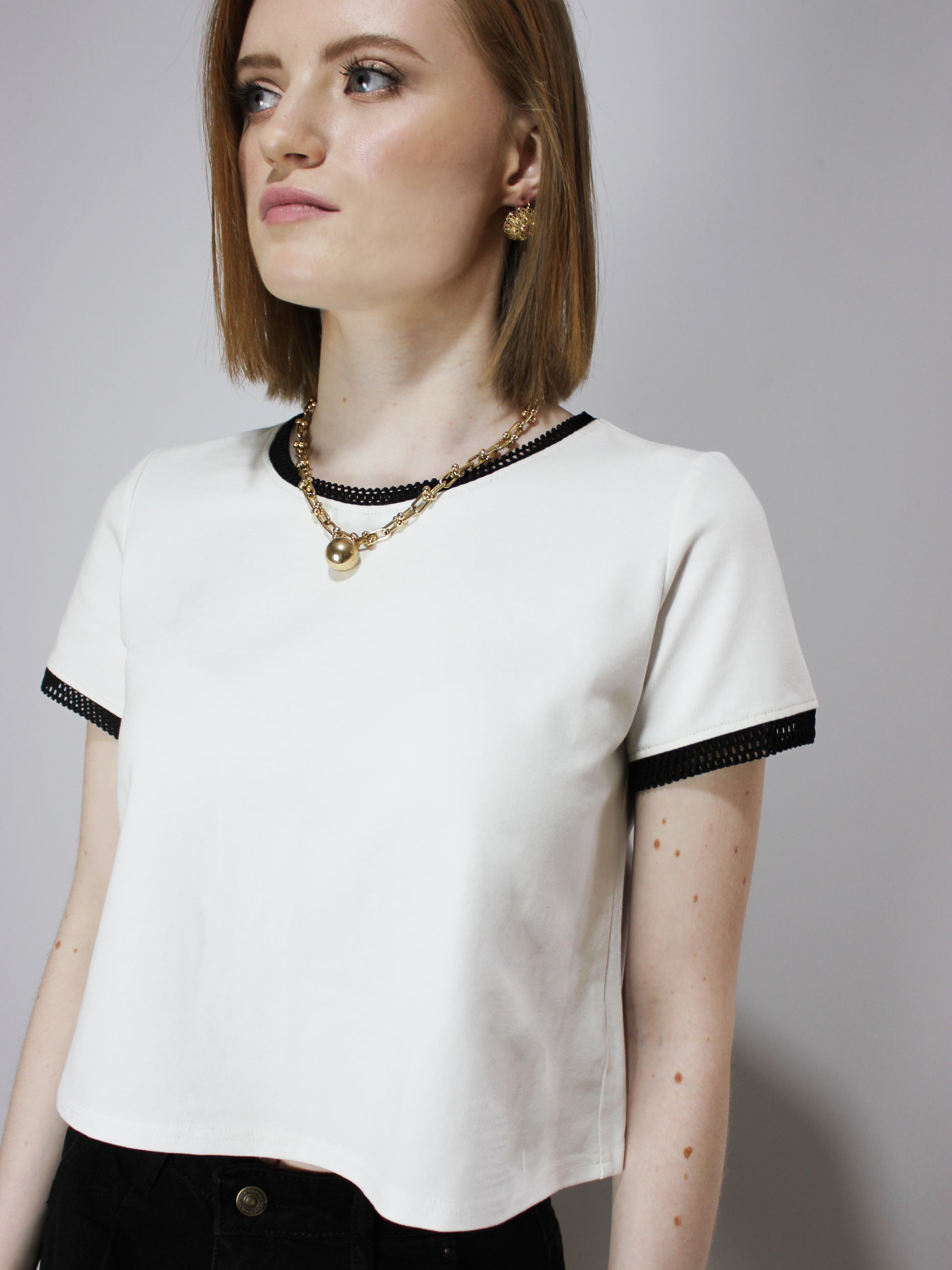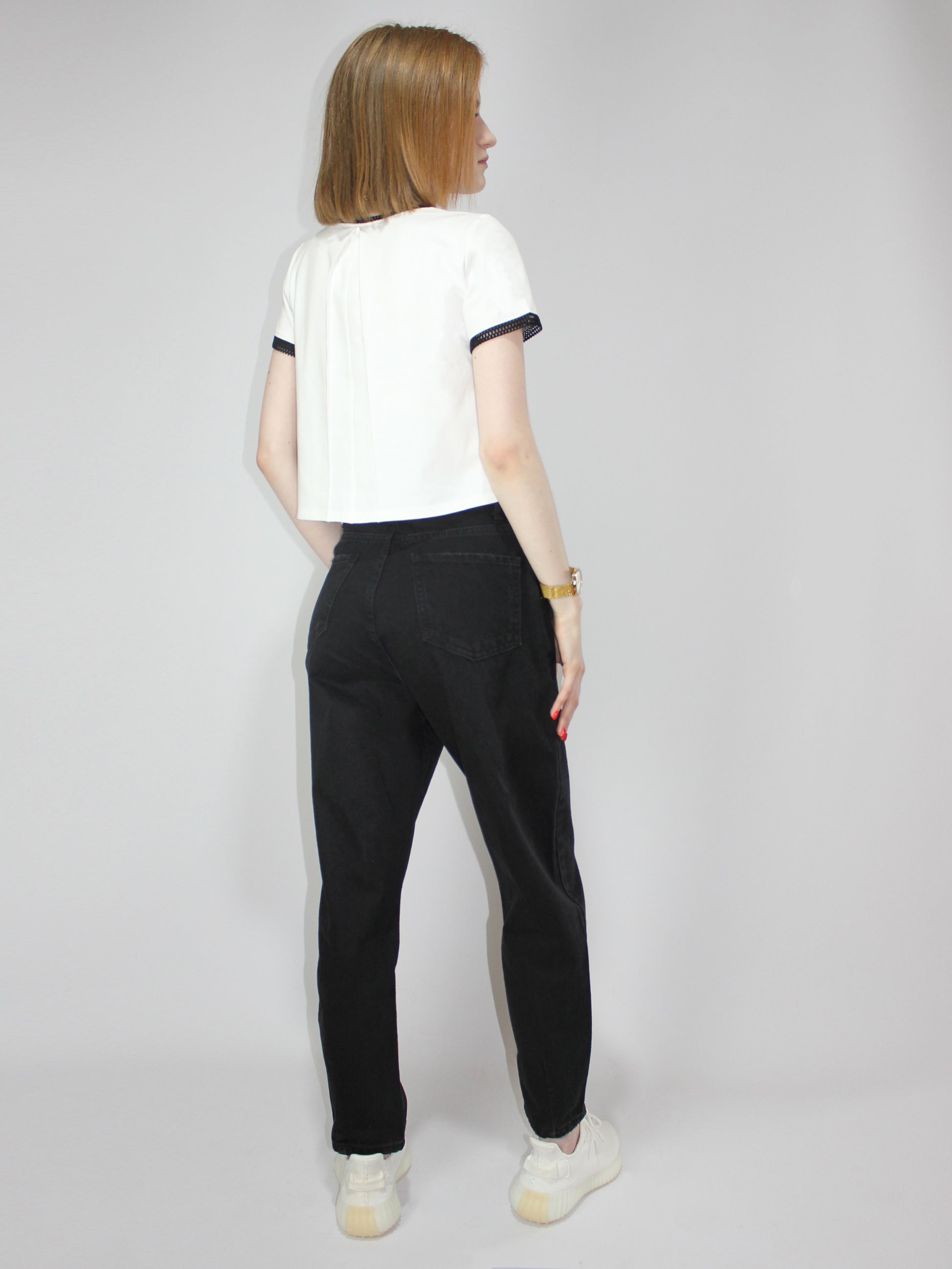 Футболка А-силуэта, расклешенная к низу. Элегантные черные сетчатые контрастные детали на коротких рукавах и горловине. Черная кайма не линяет и не оставляет цветных следов. Круглый вырез. Однотонный базовый белый элегантный укороченный топ для лета и весны. Модный, молодежный, подойдет для девочек-подростков на каждый день! С этой летней футболкой вы сможете создать множество образов! Незаменимая вещь в вашем гардеробе! Высококачественная турецкая хлопковая ткань прослужит вам долгие годы. Вы будете в восторге от качества! Французский шик в каждой детали.