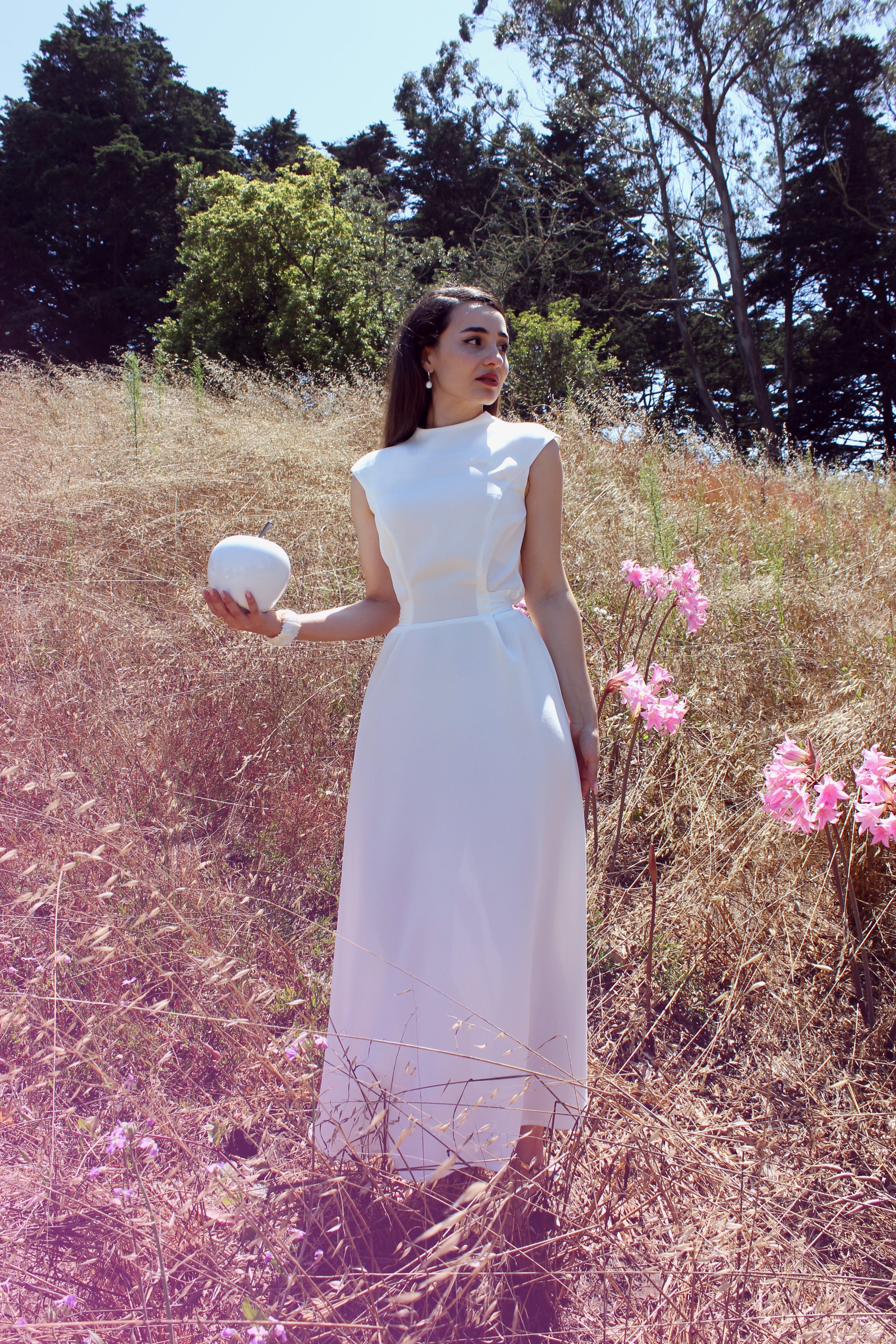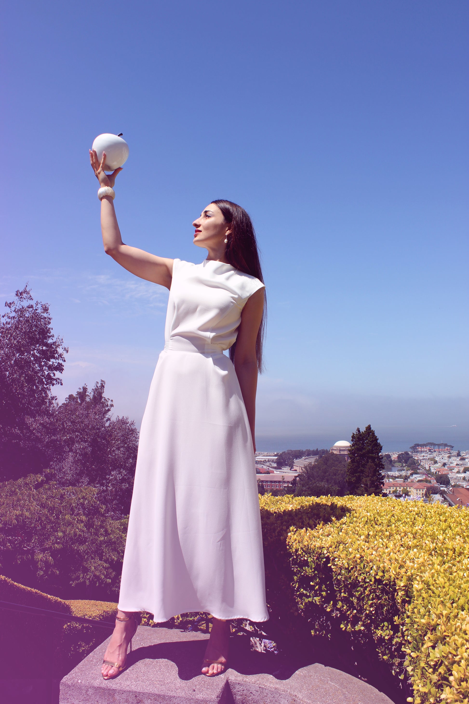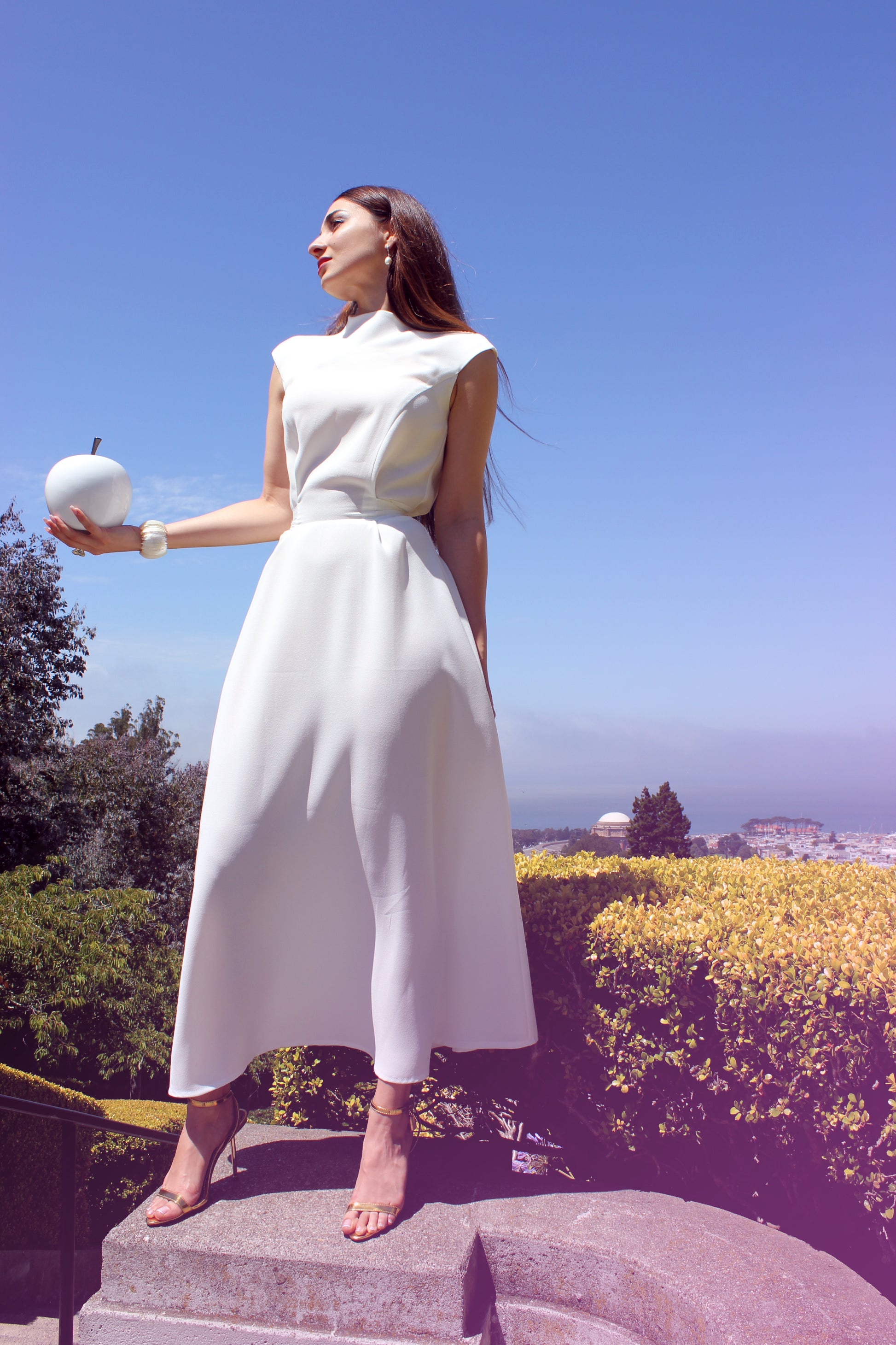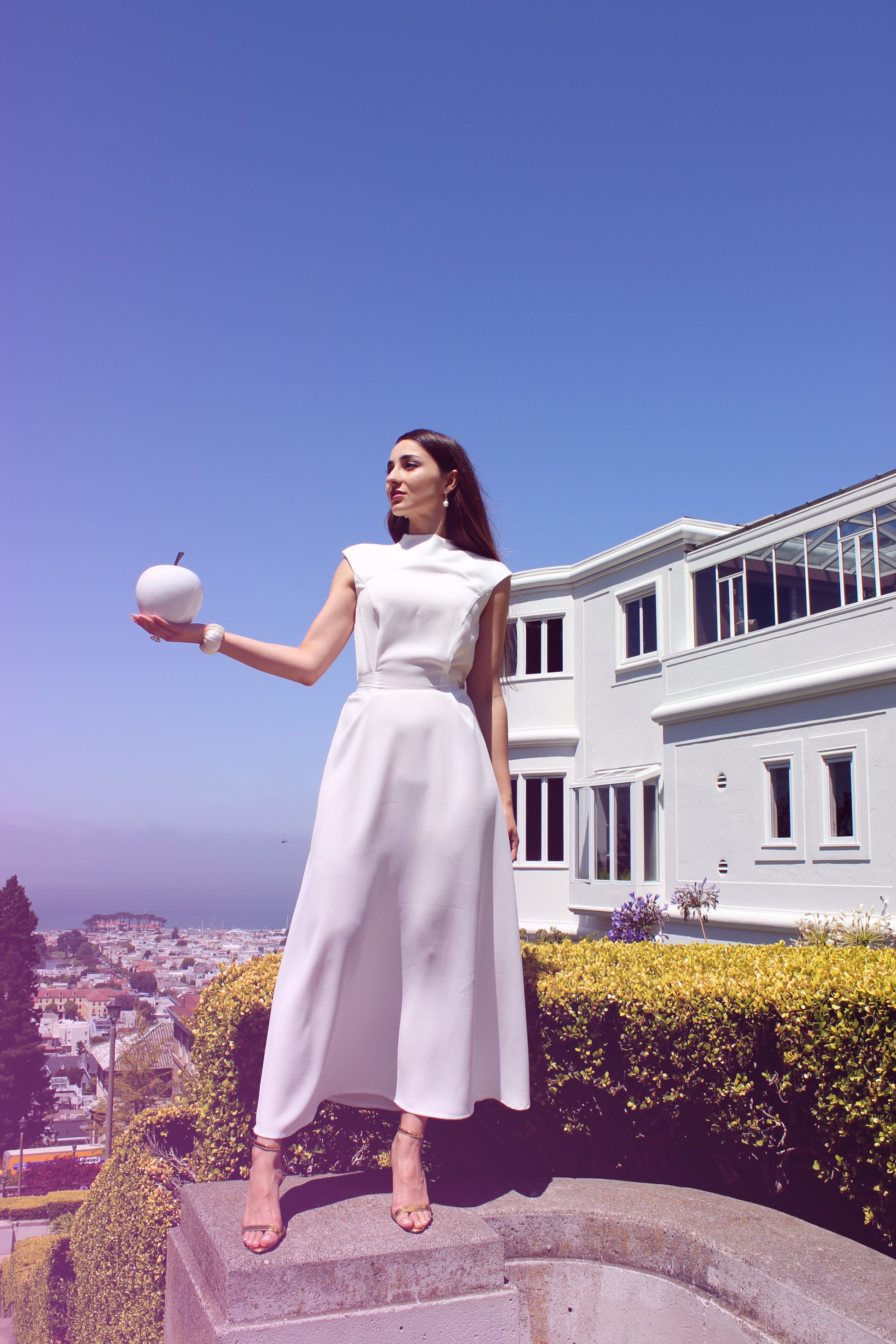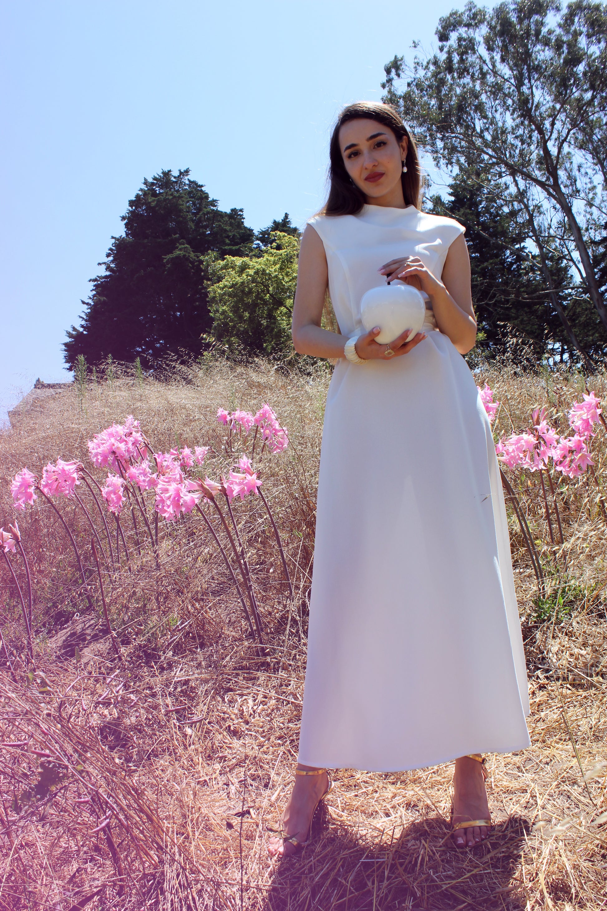 Элегантное платье из чистого белого матового крепа с элегантным длинным втачным поясом, который регулируется по любой талии с помощью удобной резинки, вшитой сзади платья.