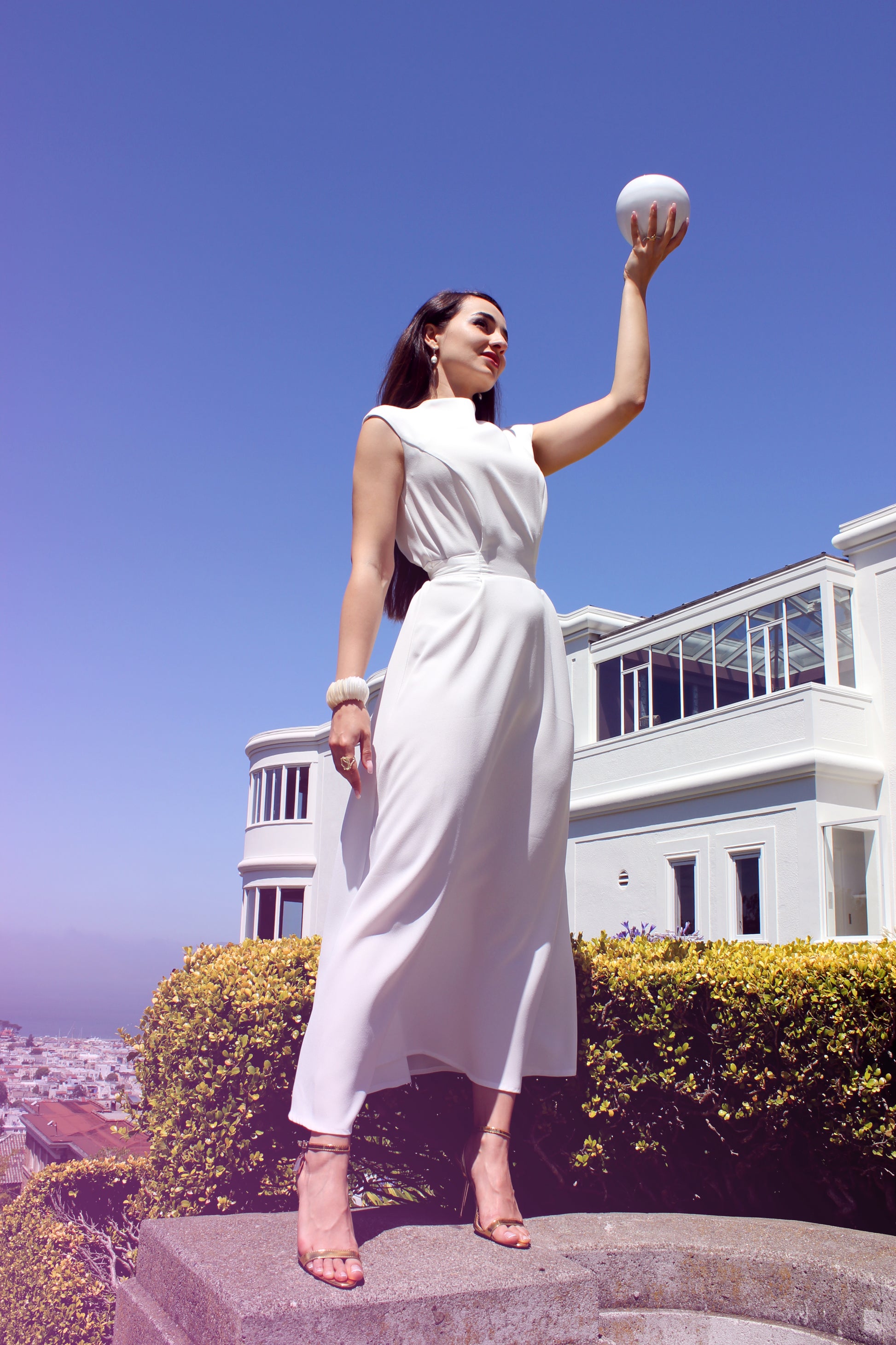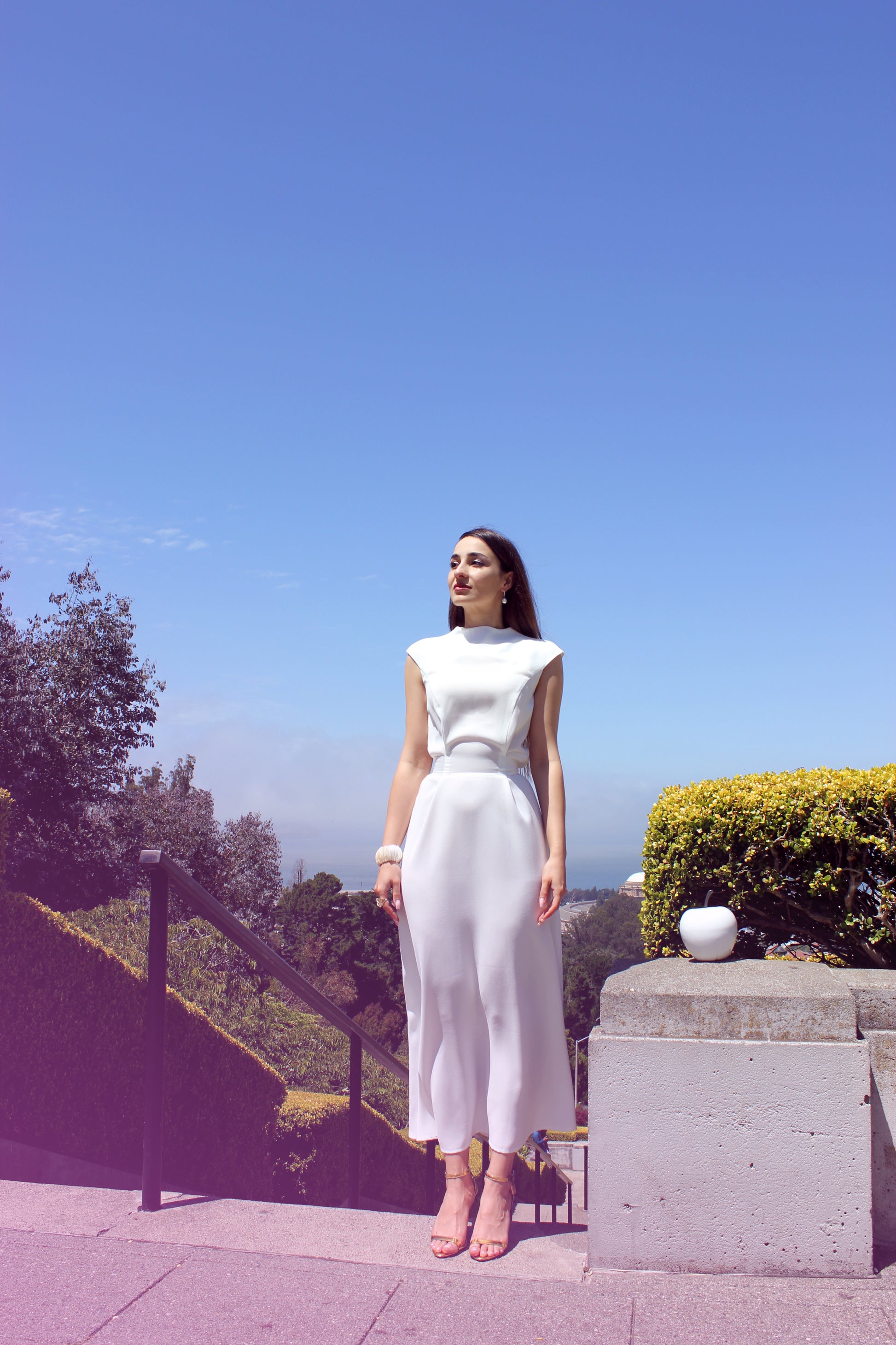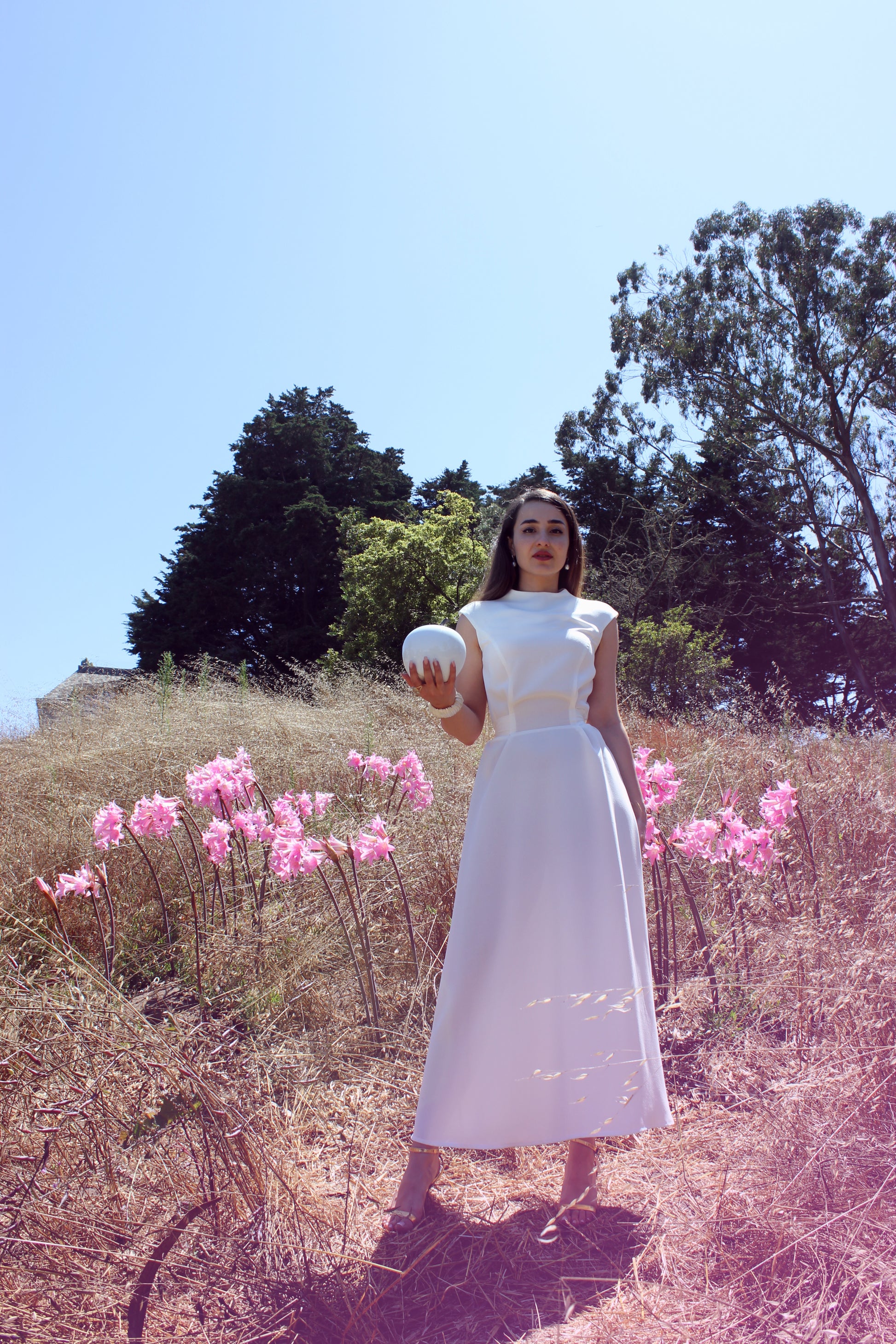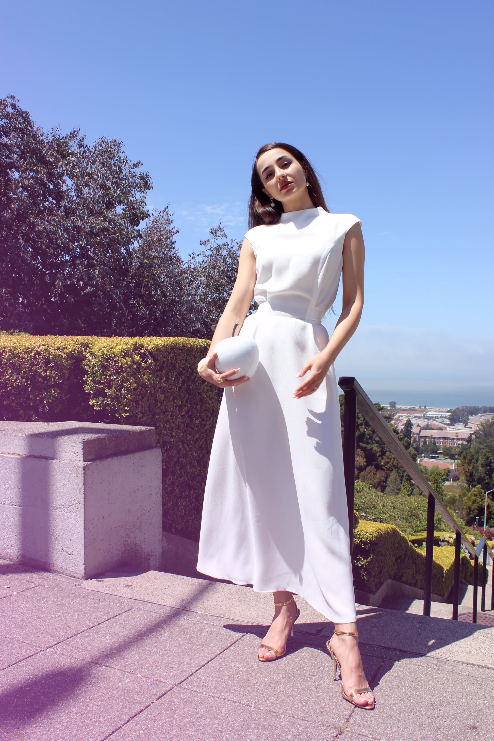 Элегантное платье из чистого белого матового крепа с элегантным длинным втачным поясом, который регулируется по любой талии с помощью удобной резинки, вшитой сзади платья.